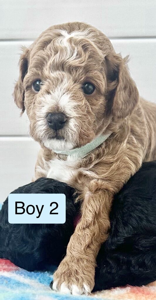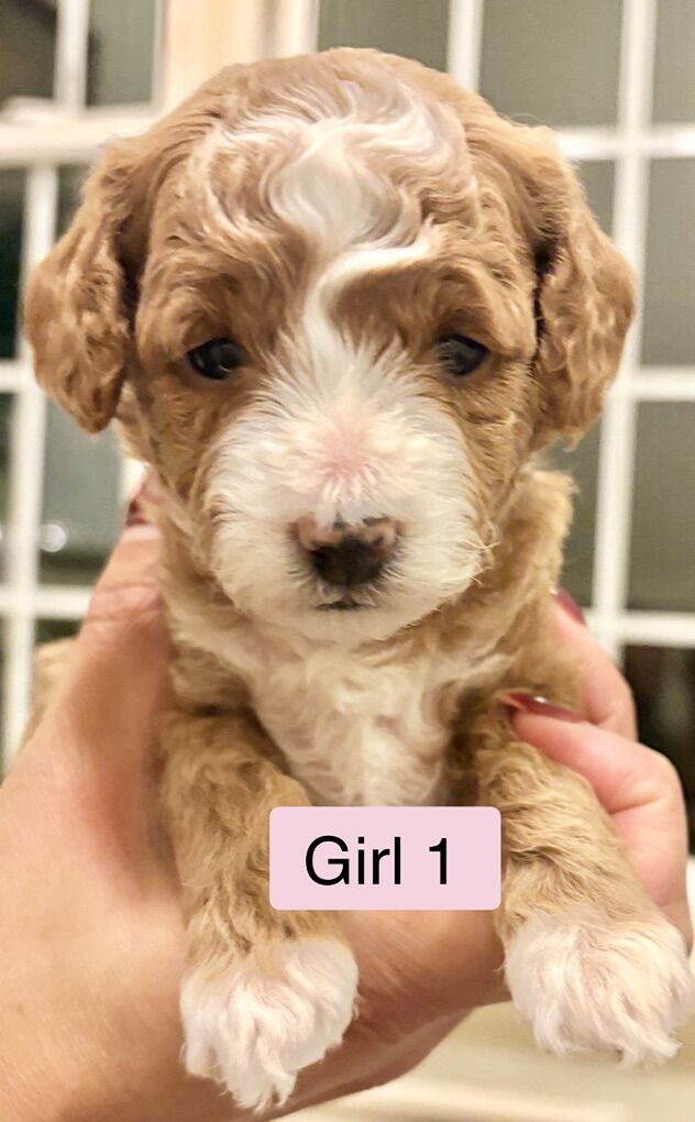 Girl 1 - $1200 This little girl is an angel! She’s our smallest puppy. The smallest puppies in our other litters range from 3-6 lbs fully grown. She is being sold with breeding rights. Her colors and markings are phenomenal for breeding doodle dogs. She is a sweet cuddle bug that can be your new side kick!