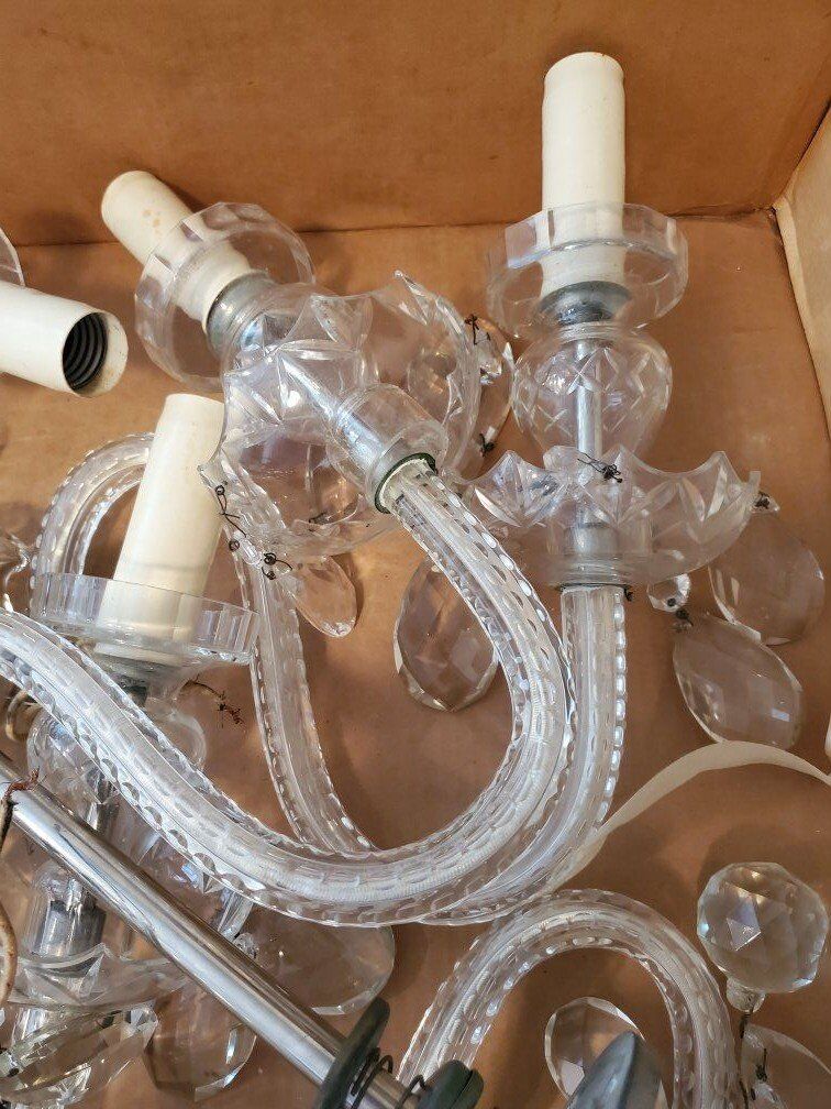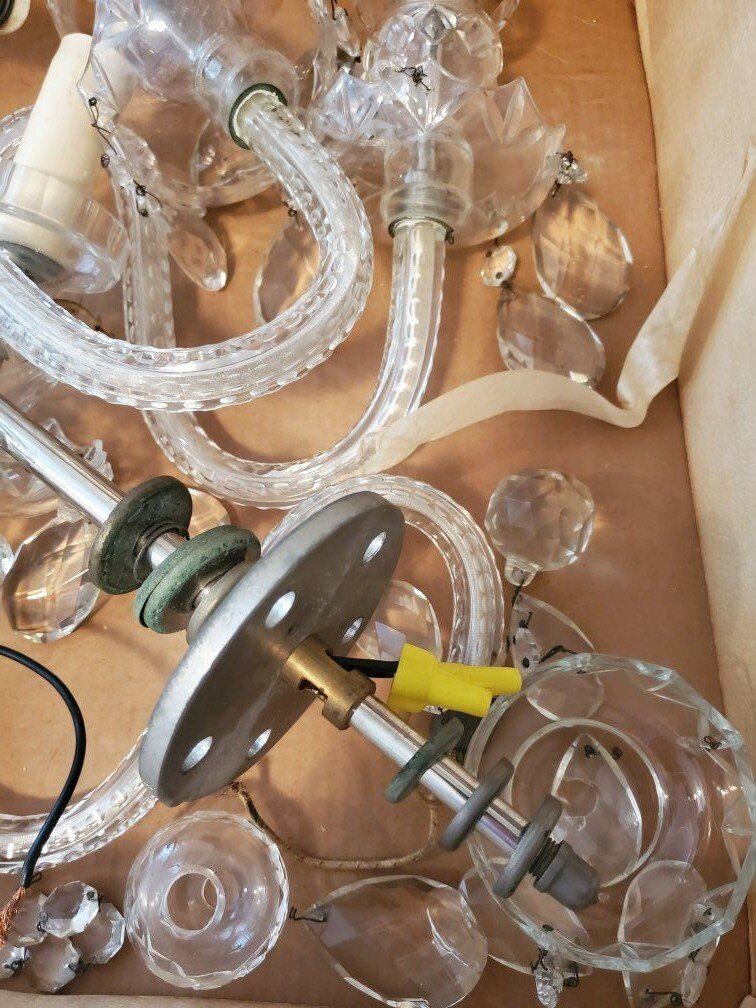 Many crystals, different shapes, arms, bowls, schonbeks, etc. One of the bowls is broken beyond repair so if you feel you are up for a puzzle and want to put this back together, you will need an extra bowl (available online). Cash only please.