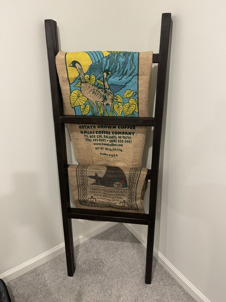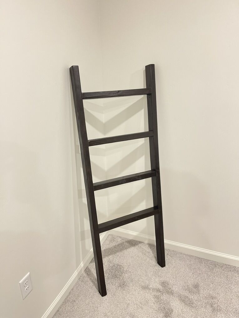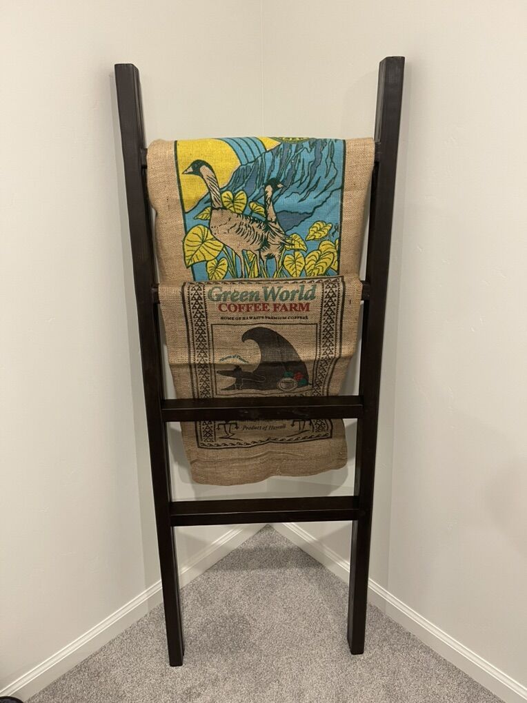 Handmade wooden blanket ladder, perfect for displaying blankets, quilts, towels, or decorative fabrics. Sanded smooth, stained in a dark Kona finish, and sealed with polyurethane for protection and durability. Adds a simple rustic touch to any room while keeping blankets organized and easy to reach.