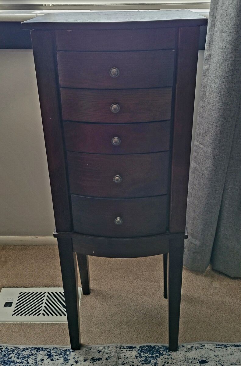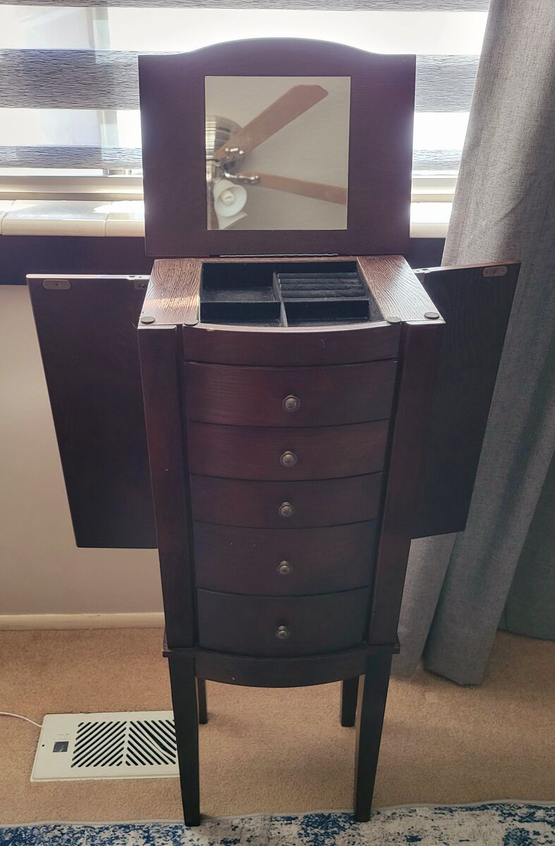VenmoSolid wood, standing jewelry box, folding top with mirror, magnetic shut side doors. Sizes are in photos, please check pictures before asking.