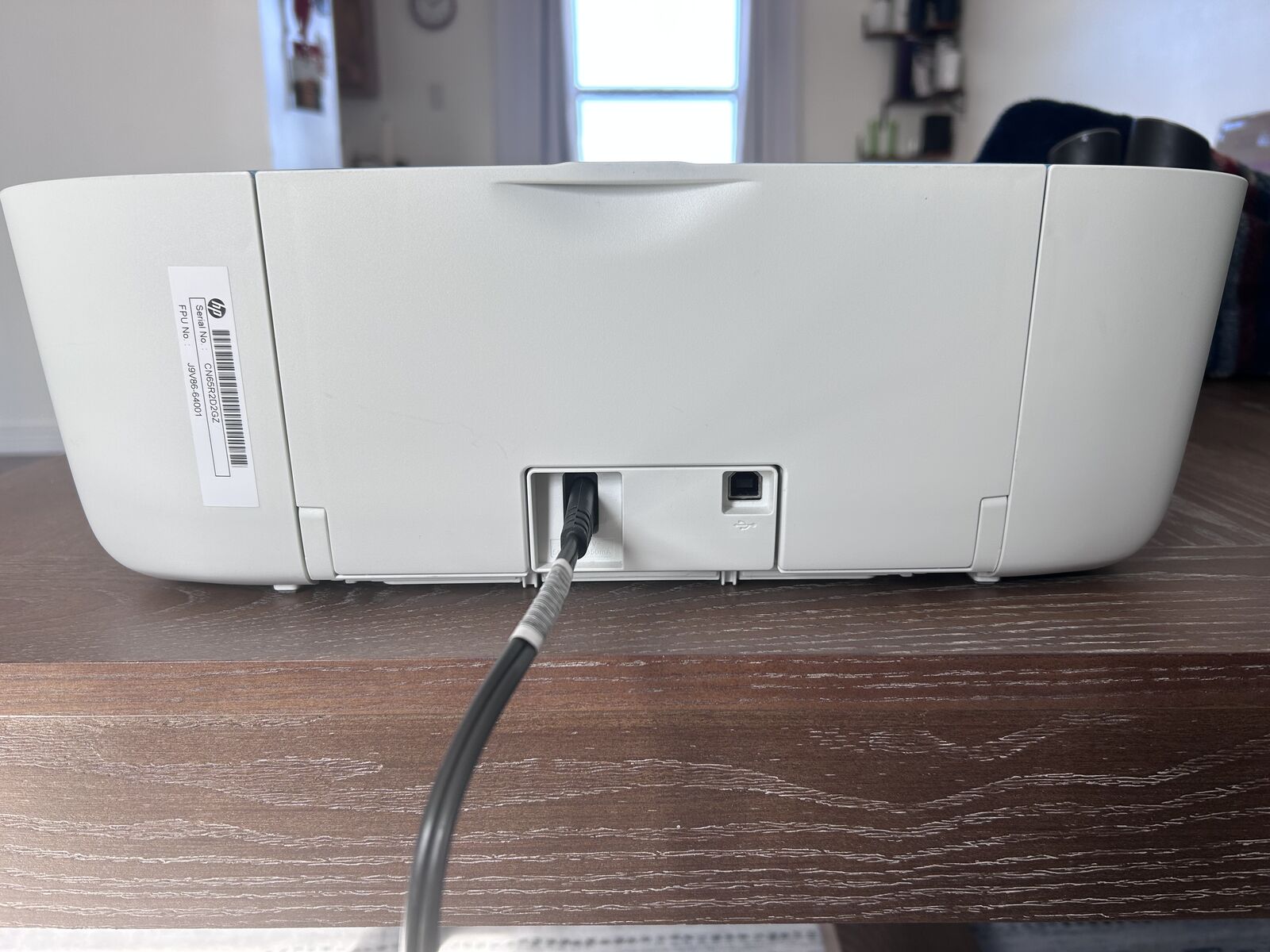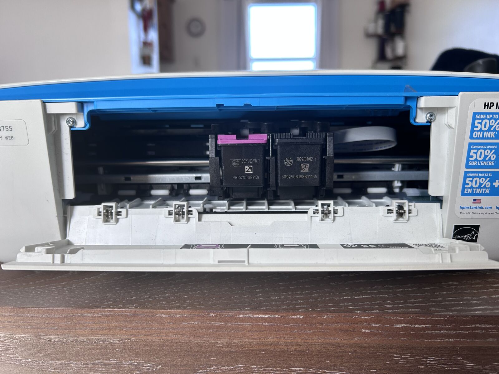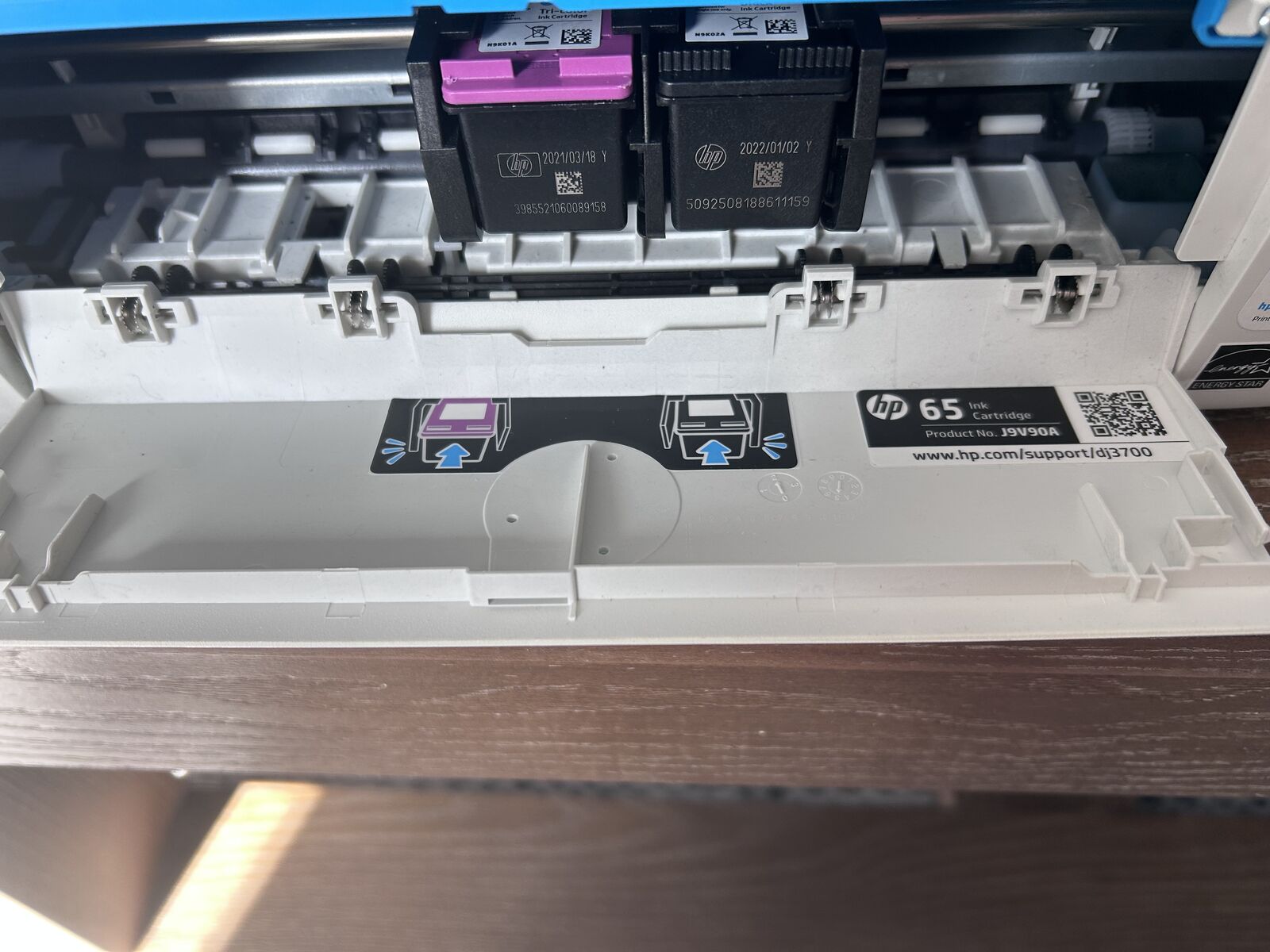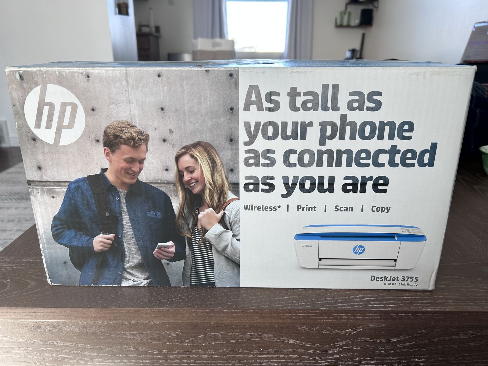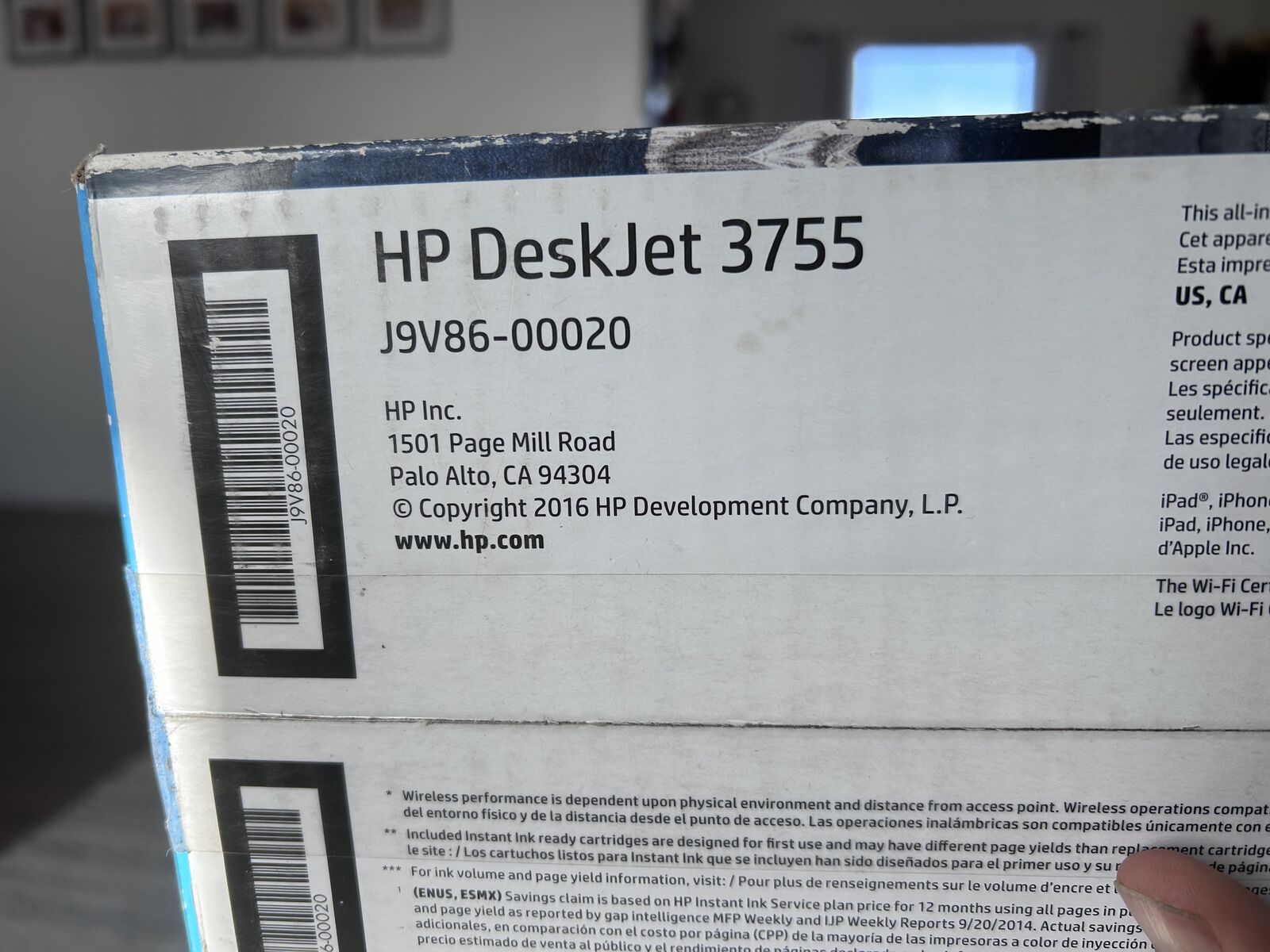 HP DeskJet 3755 (model series J9V86 / J9V90 variants), a compact all-in-one wireless inkjet printer from around 2016. It's designed for light home use: print, scan, copy; wireless/Wi-Fi (with mobile printing via app/AirPrint); HP Instant Ink ready, very small footprint (smallest all-in-one at about 5.5" tall x 15.8" wide x 7" deep.