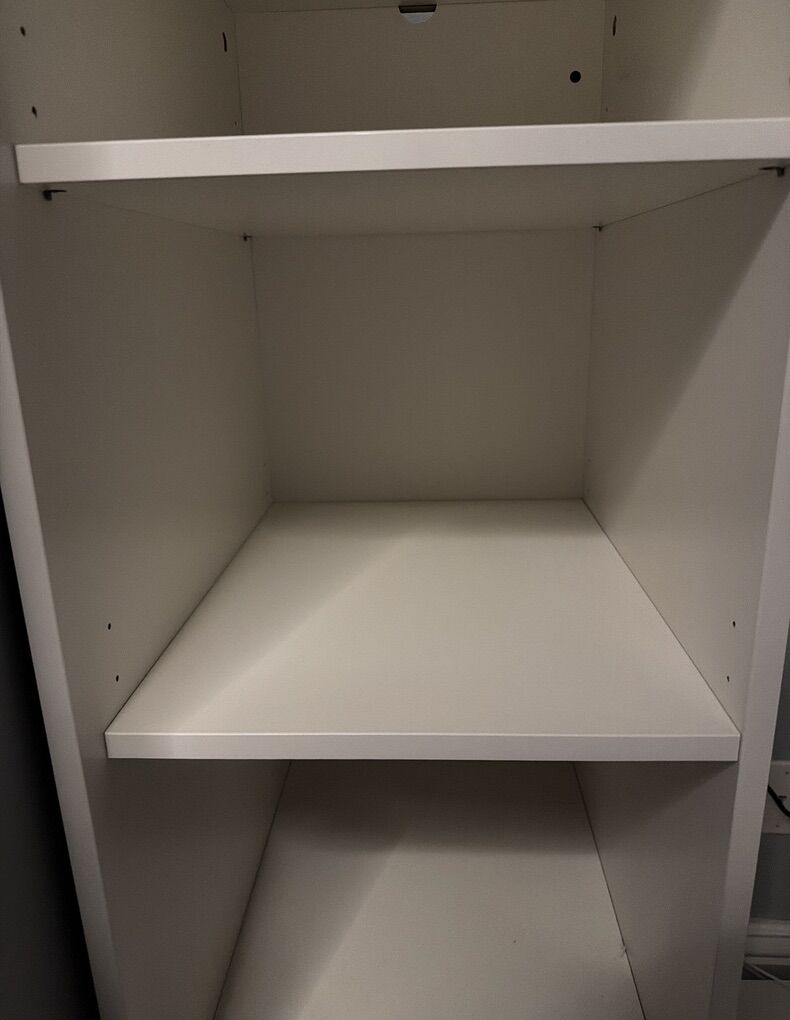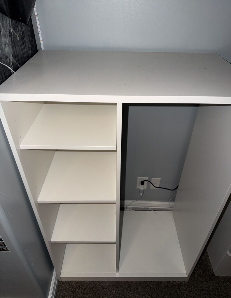 VenmoModern IKEA wardrobe dresser with a clean, minimalist look. Features four adjustable shelves, each 13 inches wide, plus a hanging section with a sturdy rod measuring 16.5 inches wide for clothes. Great for organizing folded items, shoes, or hanging everyday pieces. Overall dimensions are 4 ft tall, 31.5 in wide, and 19 in deep — ideal for efficient storage in smaller spaces.