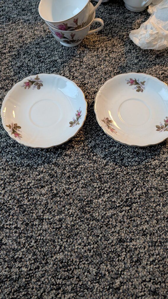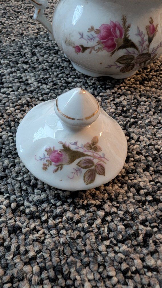 with hand-painted pink rose design Text if interested. Asking Creamer $11.00 Sugar bowl with lid $12.00 2 Teacups with saucers. $18.00 for both