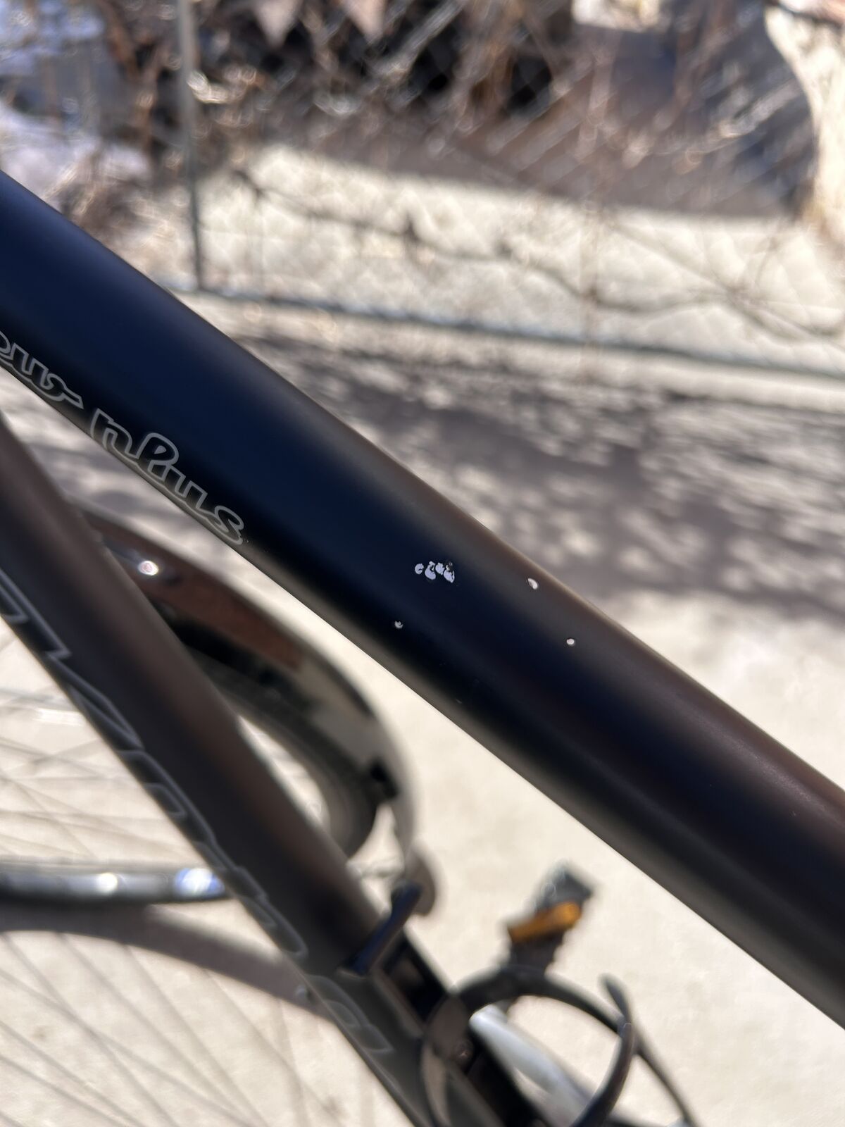 This Kona is equiped with a bottle holder, light, disc brakes, and Shimano components. It has just a few little cosmetic dings on it, but overall still looks great!