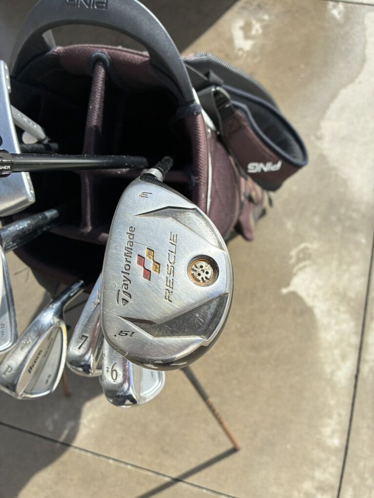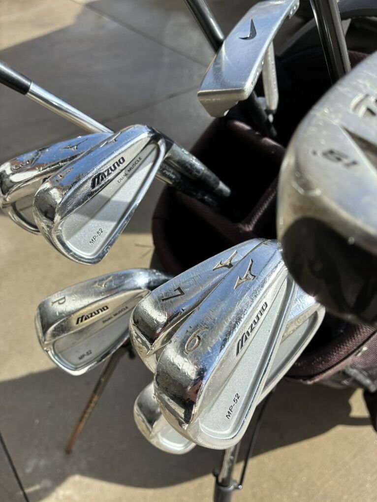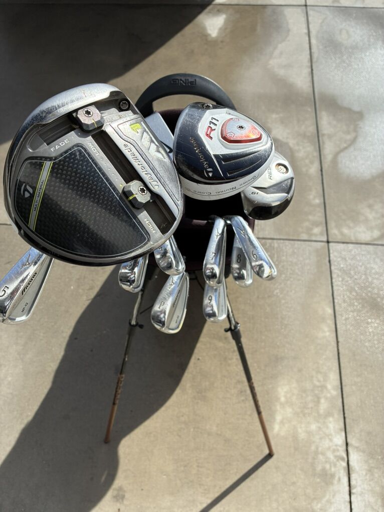 PayPalTaylor made M1 driver 10.5 degree Taylor made 3-4 wood 17 degree Taylor made rescue hybrid 19 degree Mixuno MP52 iron set 3-PW Nike putter Ping hoofer stand bag
