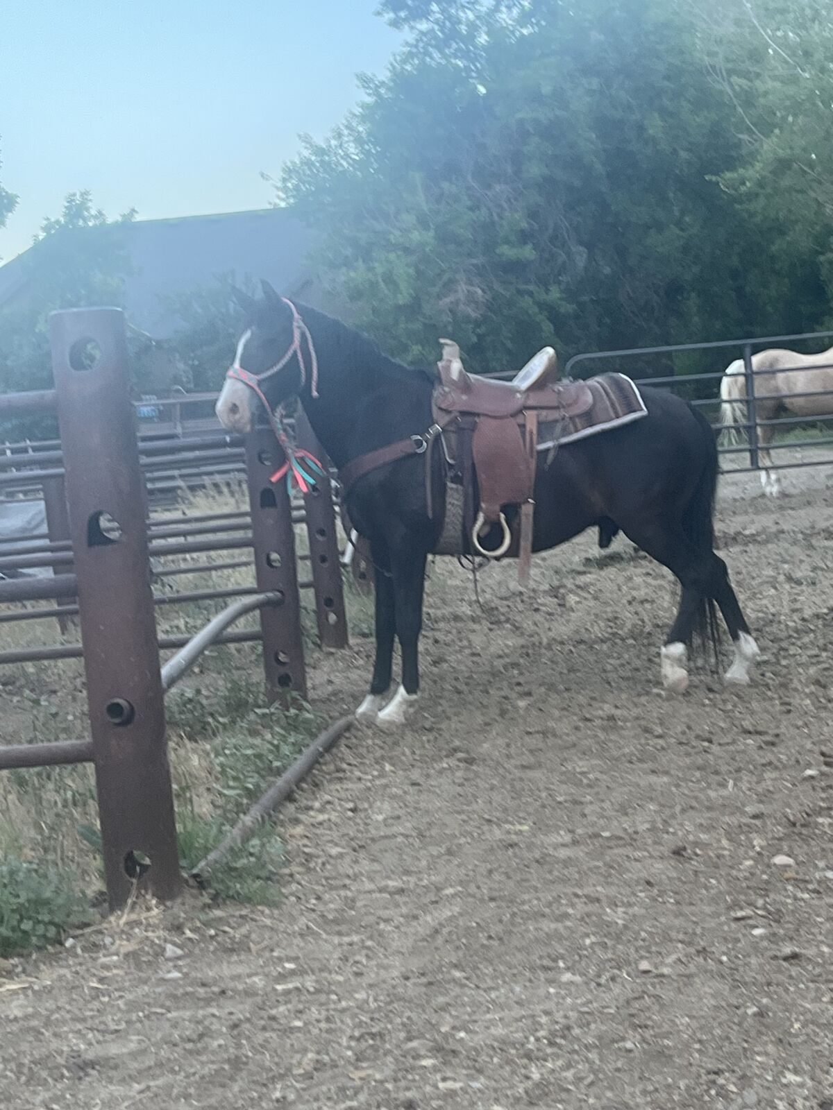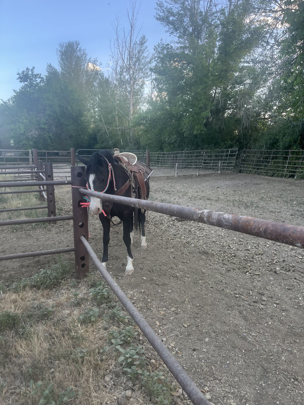 He has a little buck in him and hasn’t been out on a solid ride yet, but with consistency and miles he’ll turn into a dependable using horse. He’s stout, handy, and athletic, just not a kids’ or beginner’s horse at this stage.