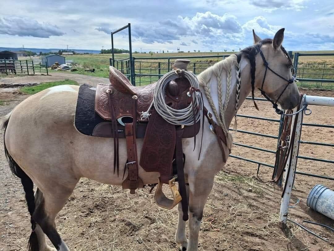 Tess is a beautiful Buckskin paint. She is 8 year old mare that stands 15 hands. She has a nice beard and feathers which I believe she has some Friesian in her. She has been used in the arena and ridden out on trails. She has a nice gate and does lope nice circles. She really has a great stop to her and is loping the barrels. She needs a confident rider.