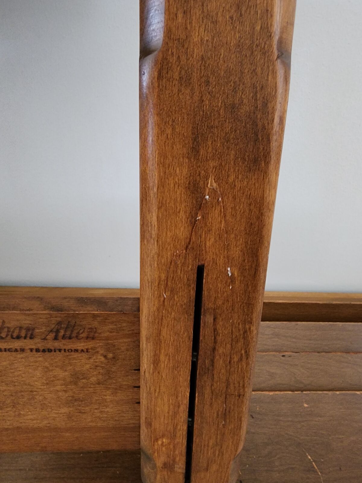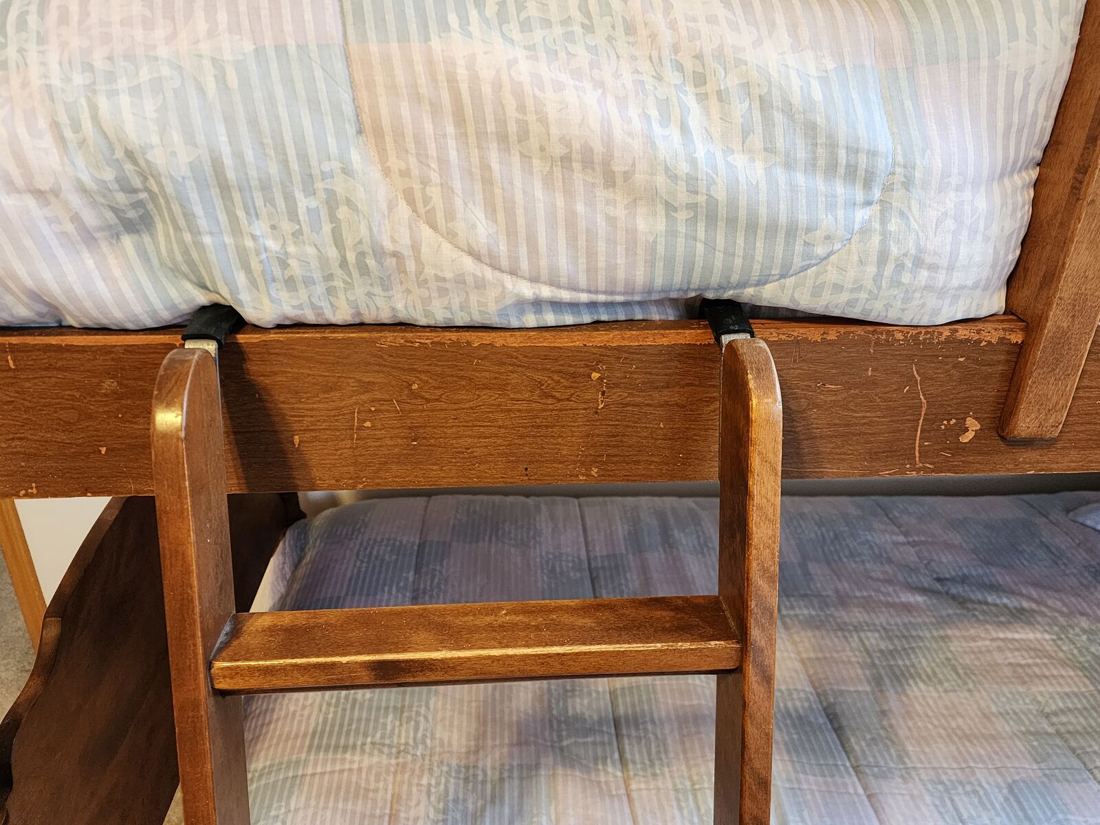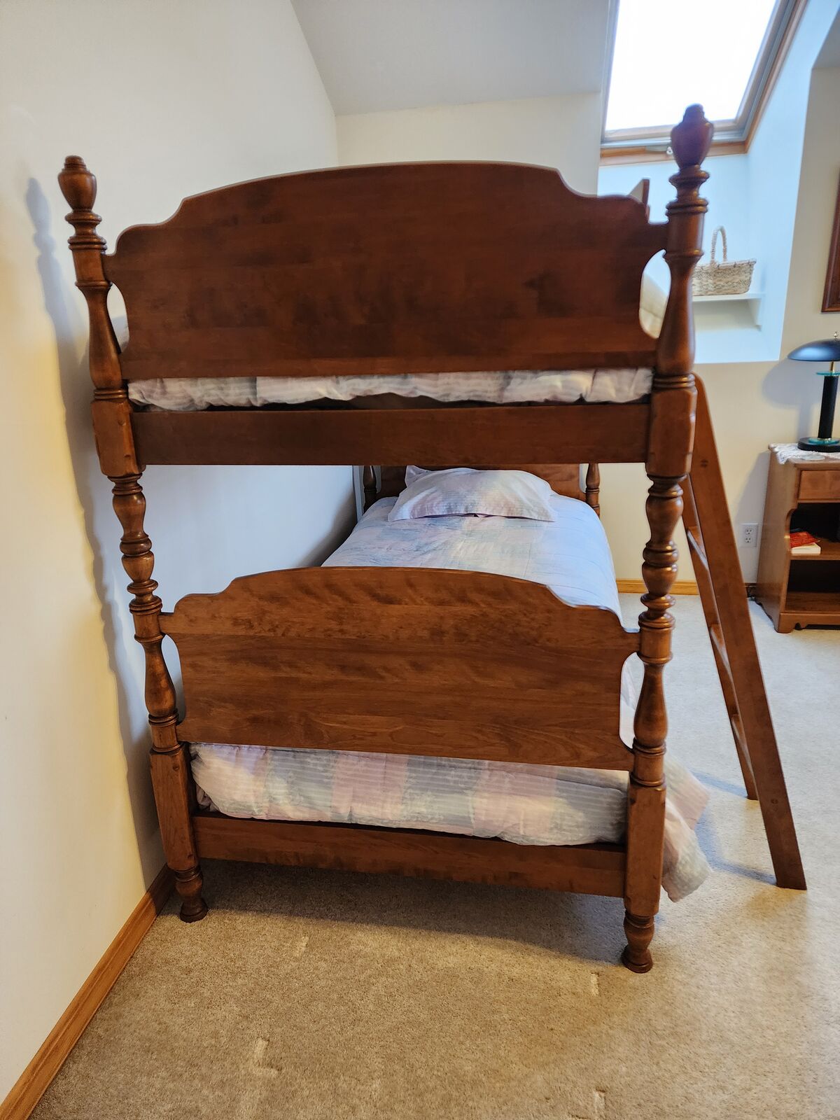 VenmoThis can be set up as bunk beds or 2 separate twin beds. Removable bed safety rail, removable ladder, and mattresses included. Beds are all wood. This is from the Ethan Allen "Heirloom" line, color: "Nutmeg ".
