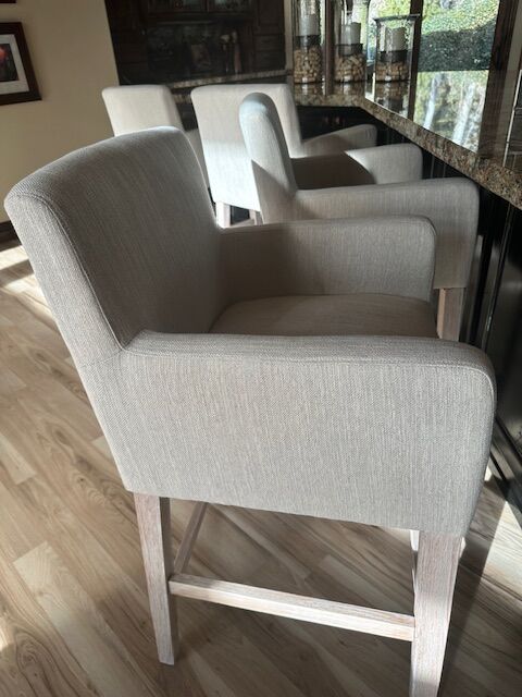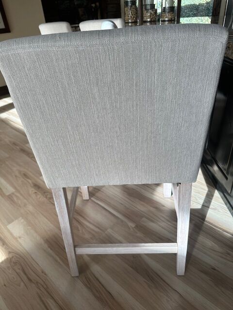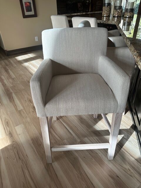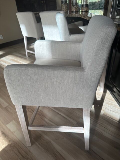 4- upholstered counter height (not bar height) stools. Brand new. Wife does not like them. My loss your gain. Paid $1000 for the 4. $400 to you. They go as a set of 4. Legs are a whitewashed oak. All perfect, just got them a week ago. Fabric is off white. Thick seat cushion and well padded arms. Very well made, will support 400 lbs.