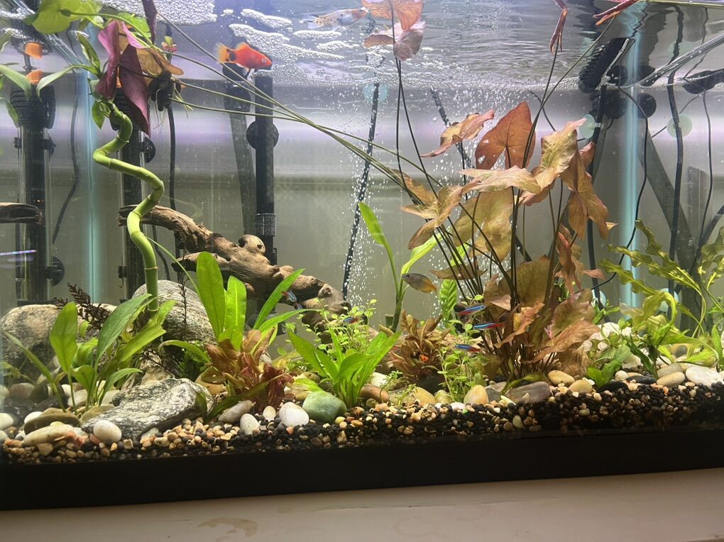 Venmo20 gallon planted aquarium with lots of extras. External canister filter, heater, air pump, plant light, thermometer. 7 neon tetras, bunch of mollys and a rainbow fish.