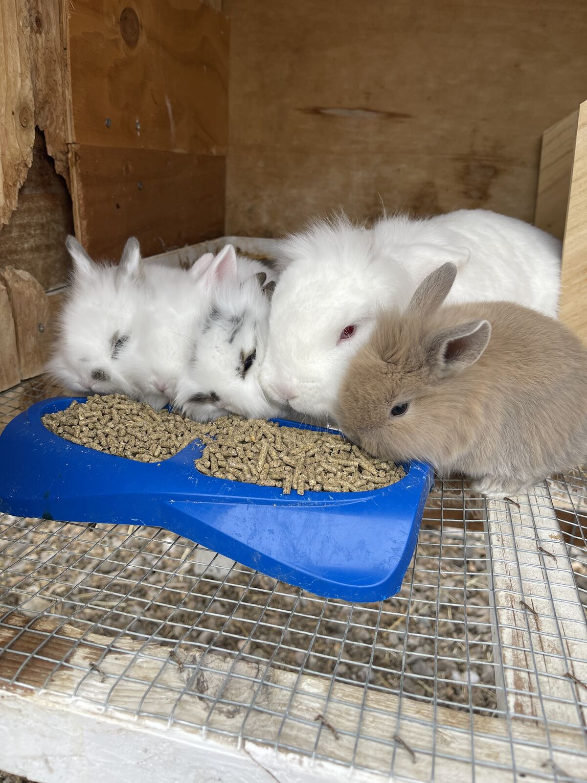 We have 4 baby bunnies available to go home on March 6th. The all white one is a female and the other three are males. They have been handled daily by adults and kids. They are so cuddly and cute! They are currently outdoors but would be great indoors too if that's the setup you're wanting. Mom is shown in the last picture. They have been handled by my daughter with much care and she is wanting them to go to loving homes.