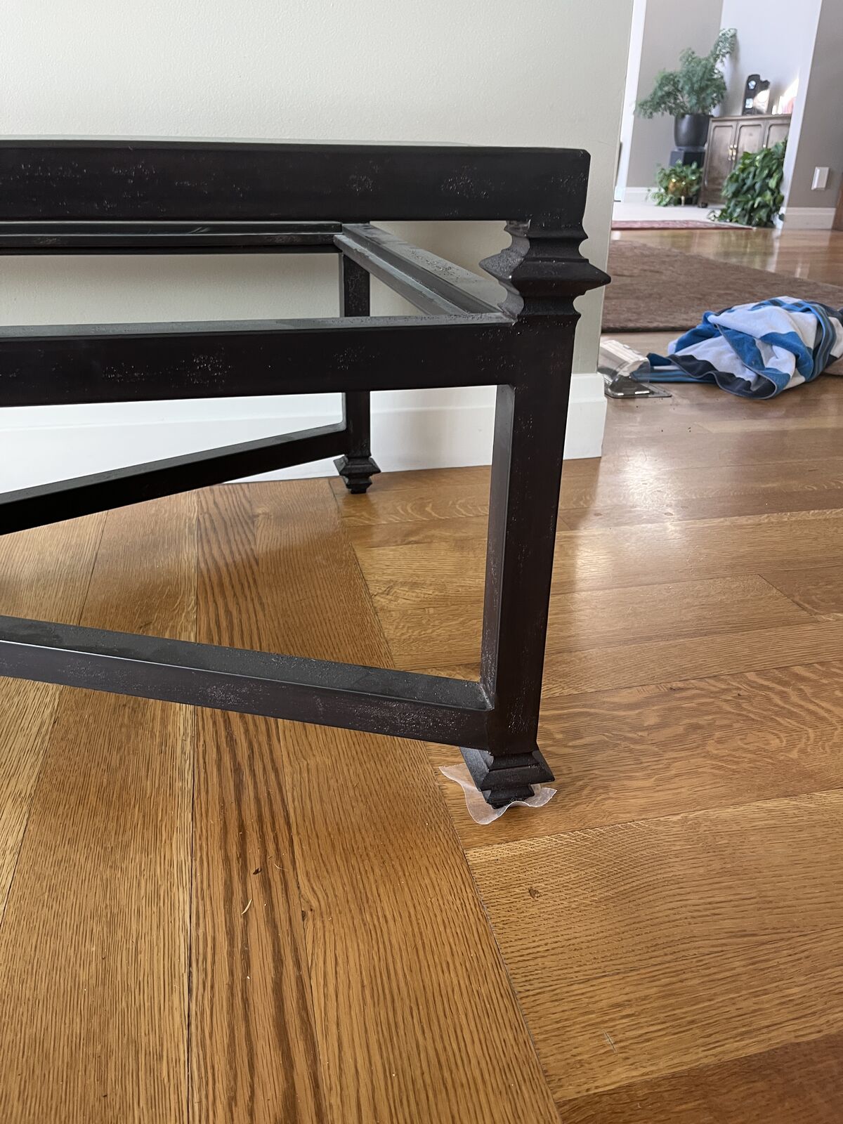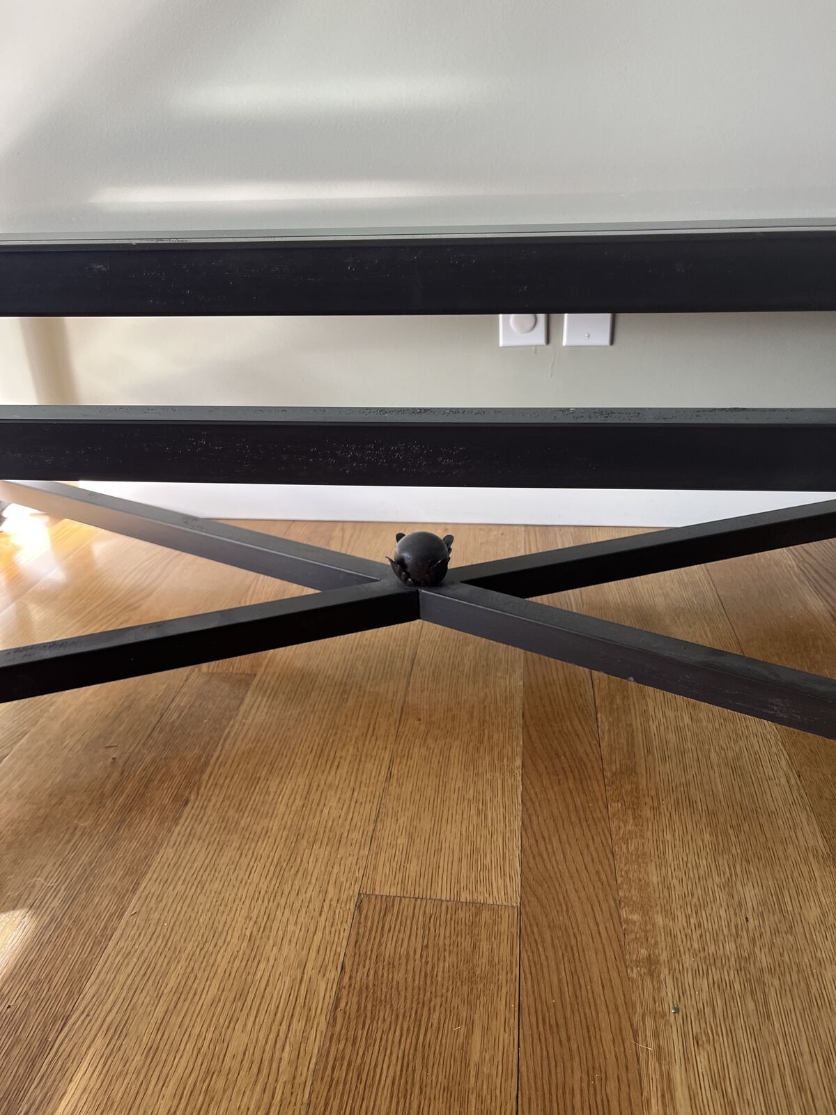 Gorgeous, 30"x60" black iron coffee table with beveled glass top. Same table still for sale at Kreiss Luxury Furniture. Mid -century Modern style, excellent condition