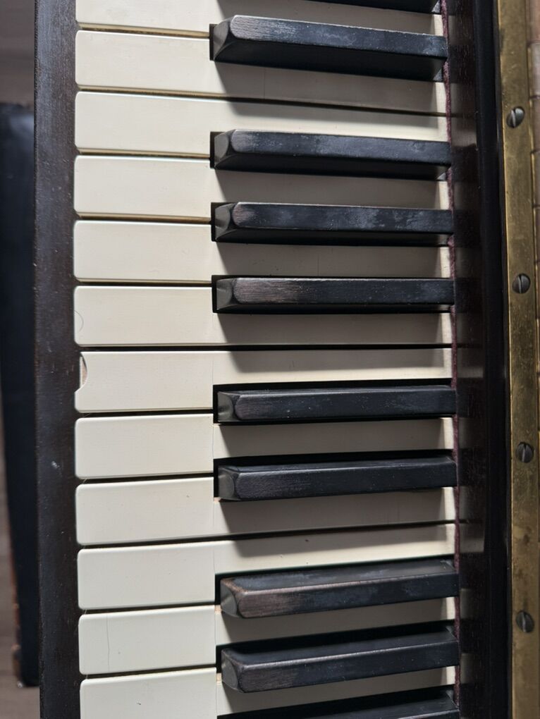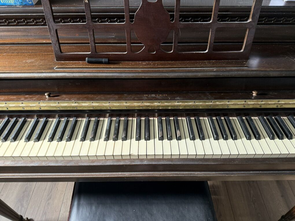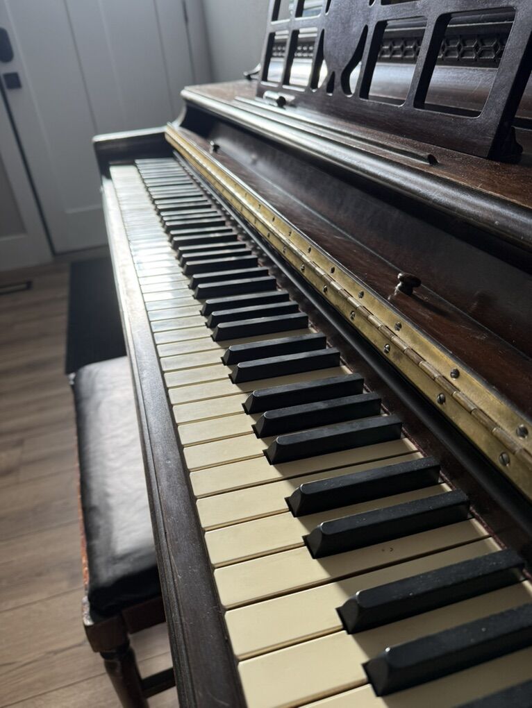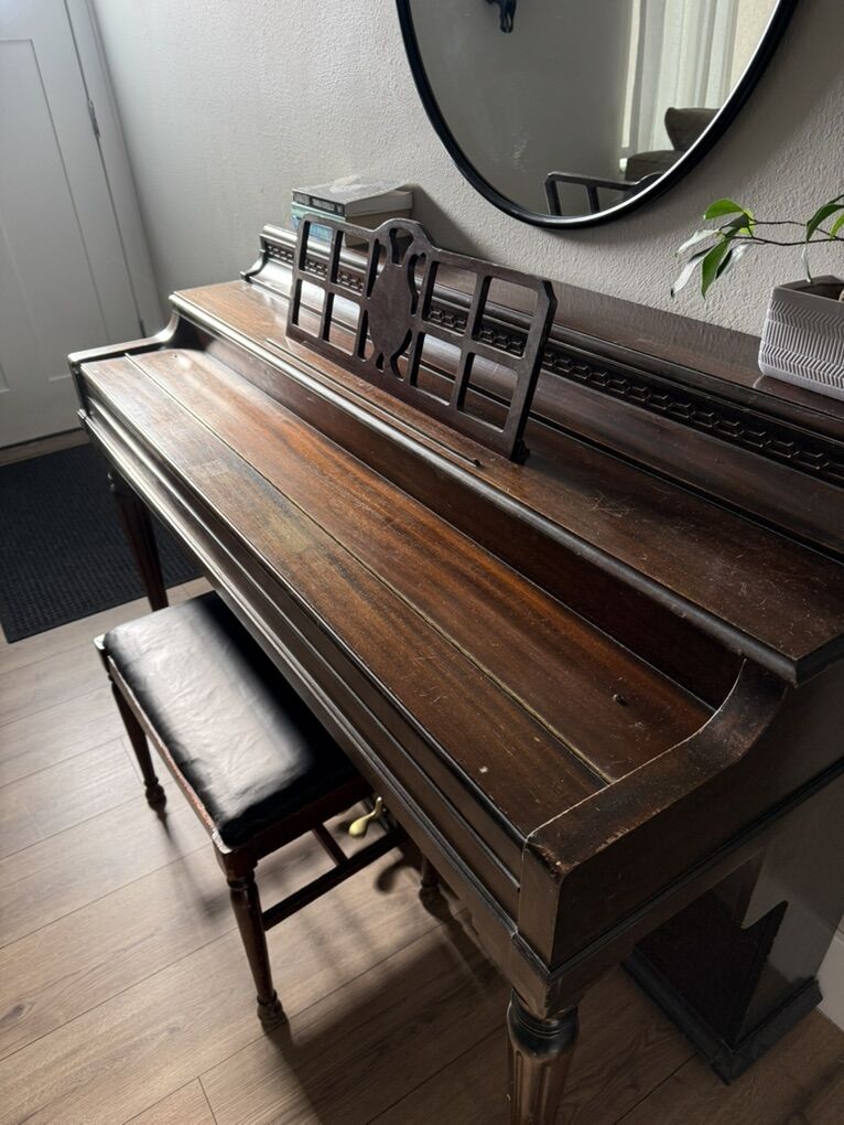 100+ year old piano, real ivory keys, recently tuned. Has a bright, metallic sound. Leather piano bench included. One of the keys is chipped and the keyboard cover has broken hinges so we remove it completely to play. Recently inherited family heirloom piano and can’t keep them both. We’ve loved this piano! Great size and gorgeous.