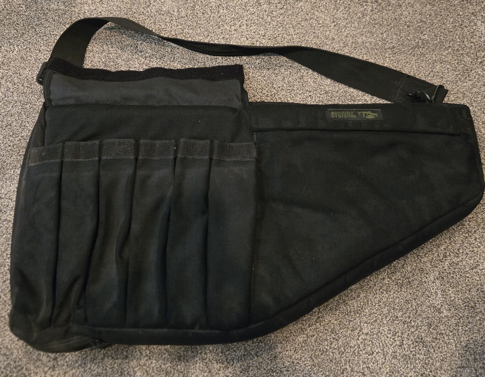 Has SIX velcro pockets for magazines plus storage pouch on the outside of the case.