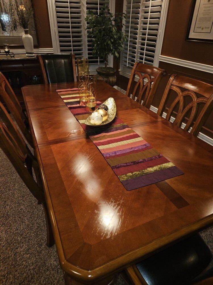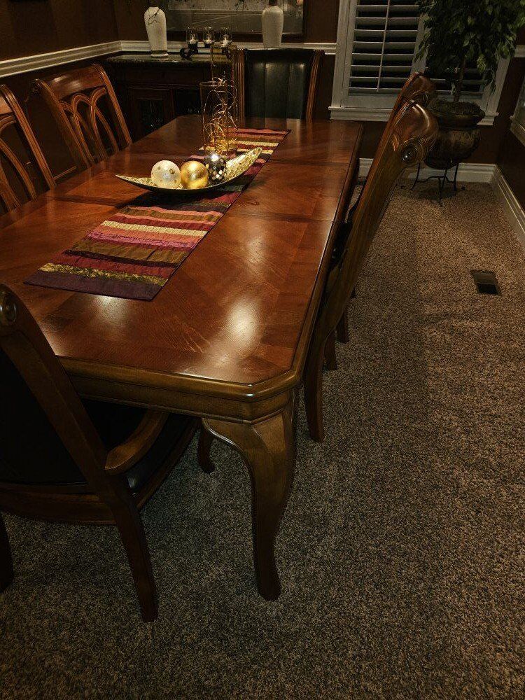 ZelleBeautiful, well‑maintained dining room set in excellent condition. The table features a rich, polished wood finish and measures 42" × 90" with the leaf installed, offering generous seating space for gatherings, holidays, and special occasions. It has been gently used only for those occasions, so the surface and structure are in great shape.