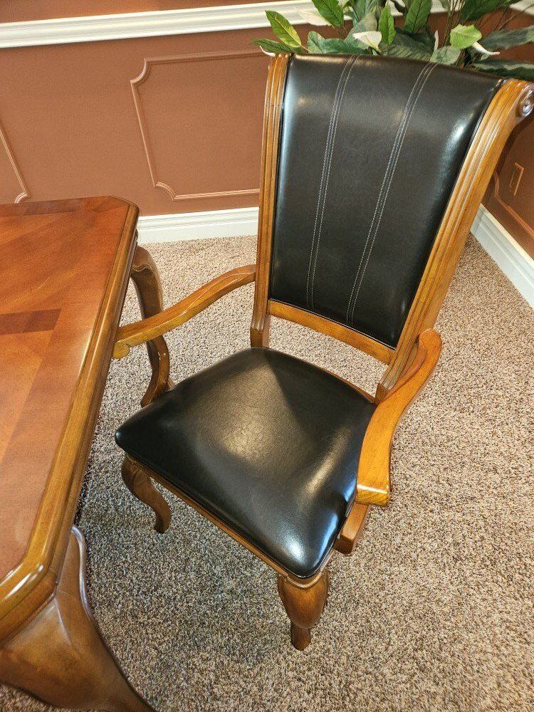 The set includes six matching leather chairs with cushioned seats and backs, decorative stitching, and sturdy wood frames. All chairs are clean, comfortable, and well cared for.
