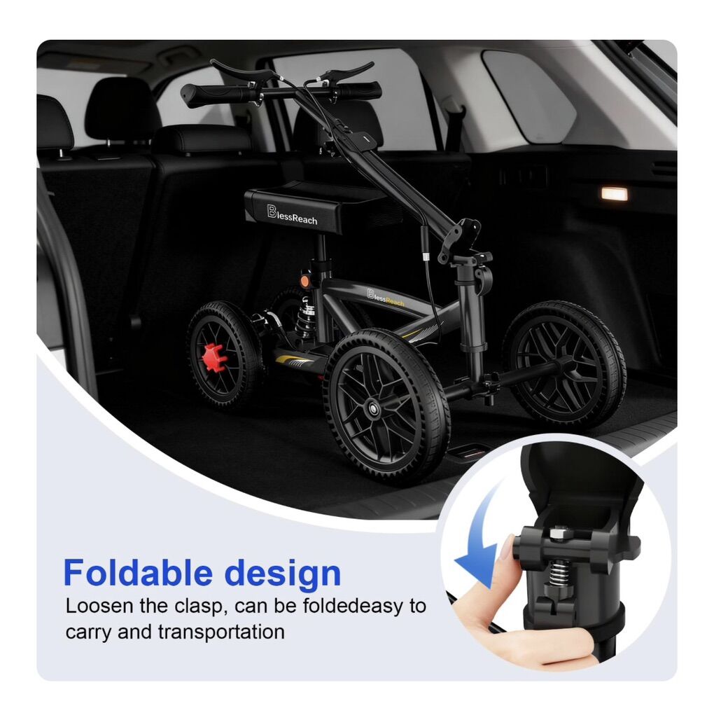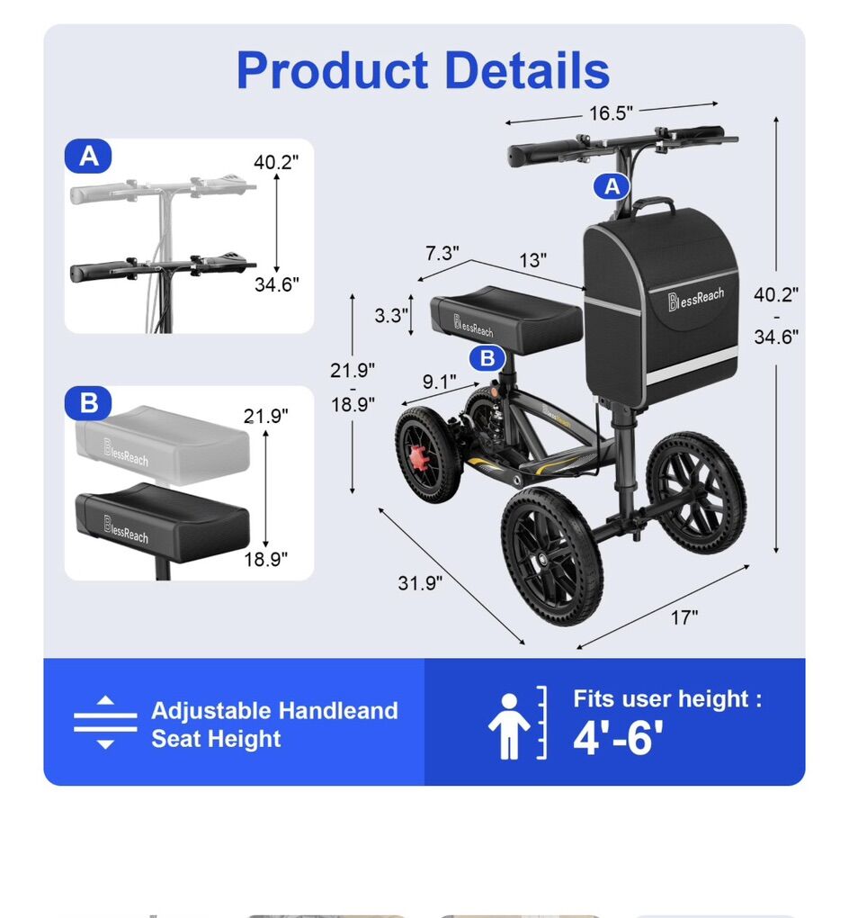 Venmo(Best Crutches Alternative) BlessReach 2022 Newly Developed Disc Brake All Terrain wheels knee scooter is the most trusted knee walkers, ideal for people with injured feet, ankles, calves, and knees, or those who have recovered from foot surgery, ankle surgery, and amputation surgery. [All-Terrain Knee Scooter) These easy to maneuver steerable knee scooter walkers feature two 11 front wheels and two 9 rear wheels, No need to inflate and explosion-proof , Reduces the trouble of inflating pneumatic tires, and is more stable and softer than other puv wheels for knee scooter. Works well on all terrains, including grass, gravel, dirt and crevices on sidewalks. [ADJUSTABLE AND FOLDABLE DESIGN BlessReach off-road scooter cane replacement offers six-level diustable knee nads and handlebars $70.00 $109.09 Your
