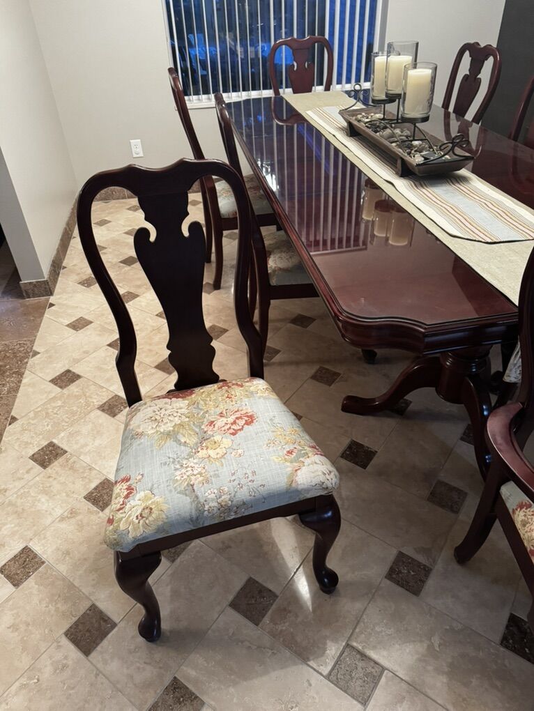 VenmoVery nice cherry dinning room table. It comes with 8 chairs. It also comes with the protective glass cover that perfectly matches the table top. With both leaves in it it measures 96” x 42”.