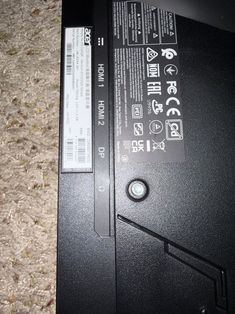 VenmoAcer Nitro ED320QR Sbiipx (Model No. ED320QR). It is a 31.5-inch curved gaming monitor with a 165Hz refresh rate and Full HD resolution. SHI Direct SHI Direct +3 Key Specifications Screen Size: 31.5-inch viewable curved display. Resolution: 1920 x 1080 (Full HD). Refresh Rate: 165Hz when using the DisplayPort; typically 144Hz via HDMI. Panel Type: Vertical Alignment (VA). Response Time: 1ms (Visual Response Boost). Curvature: 1800R. Brightness: 300 cd/m². Connectivity: 2 x HDMI ports, 1 x DisplayPort, and an Audio line-out. Sync Technology: AMD FreeSync Premium. SHI Direct SHI Direct