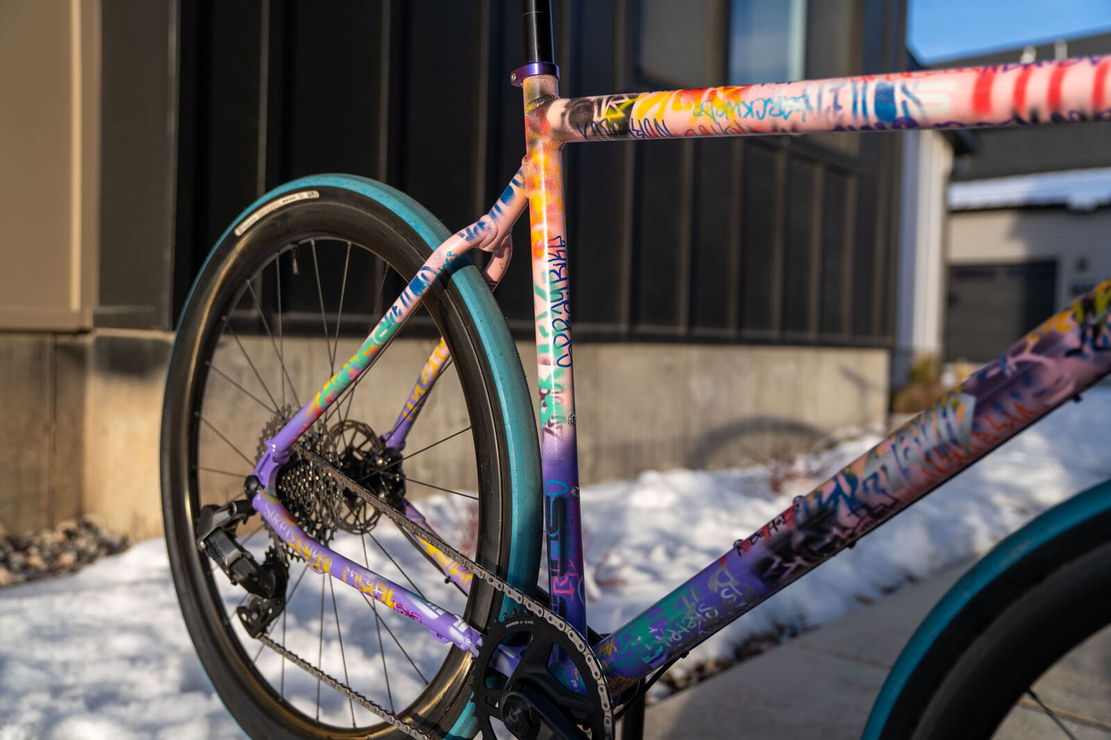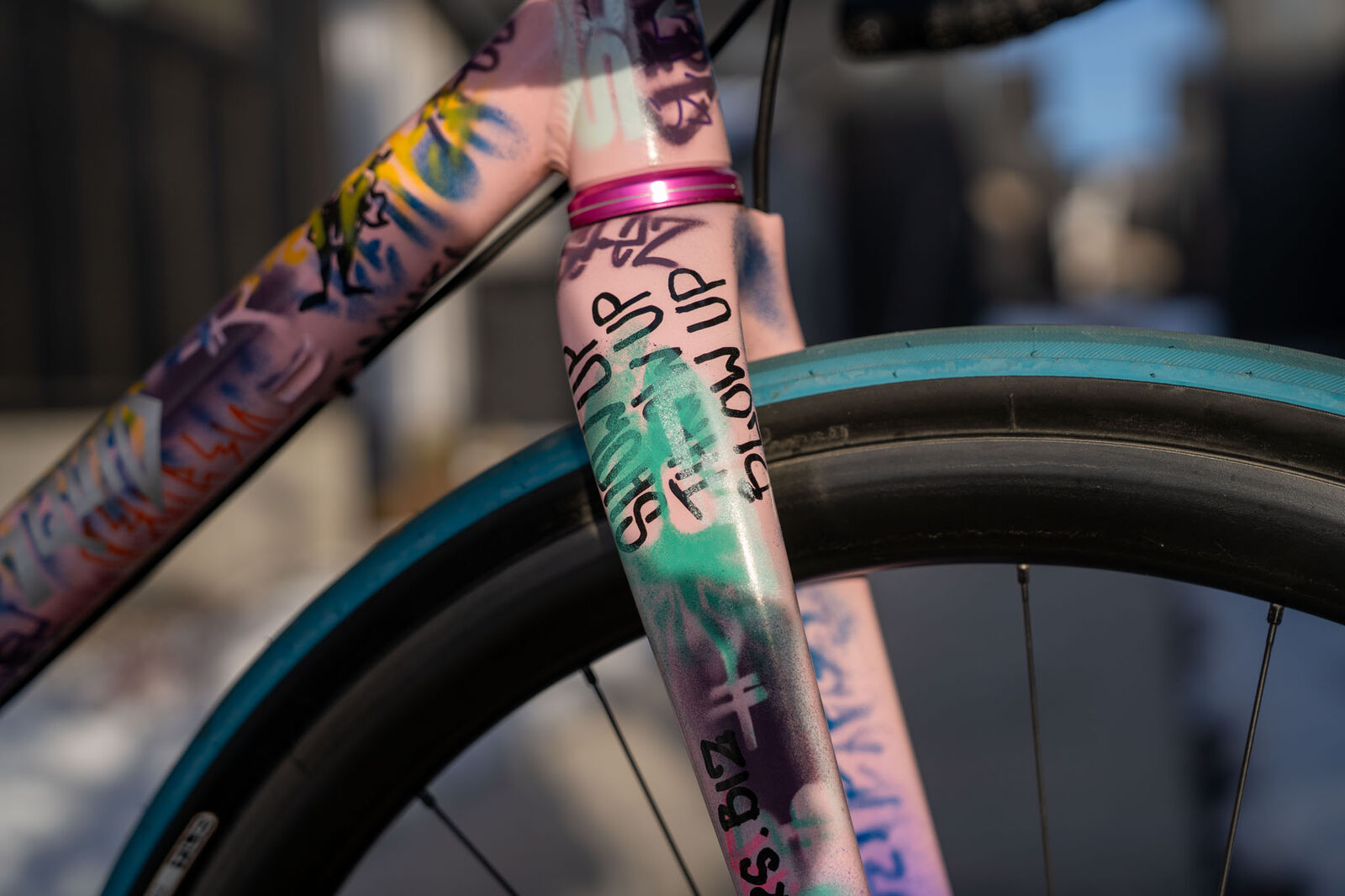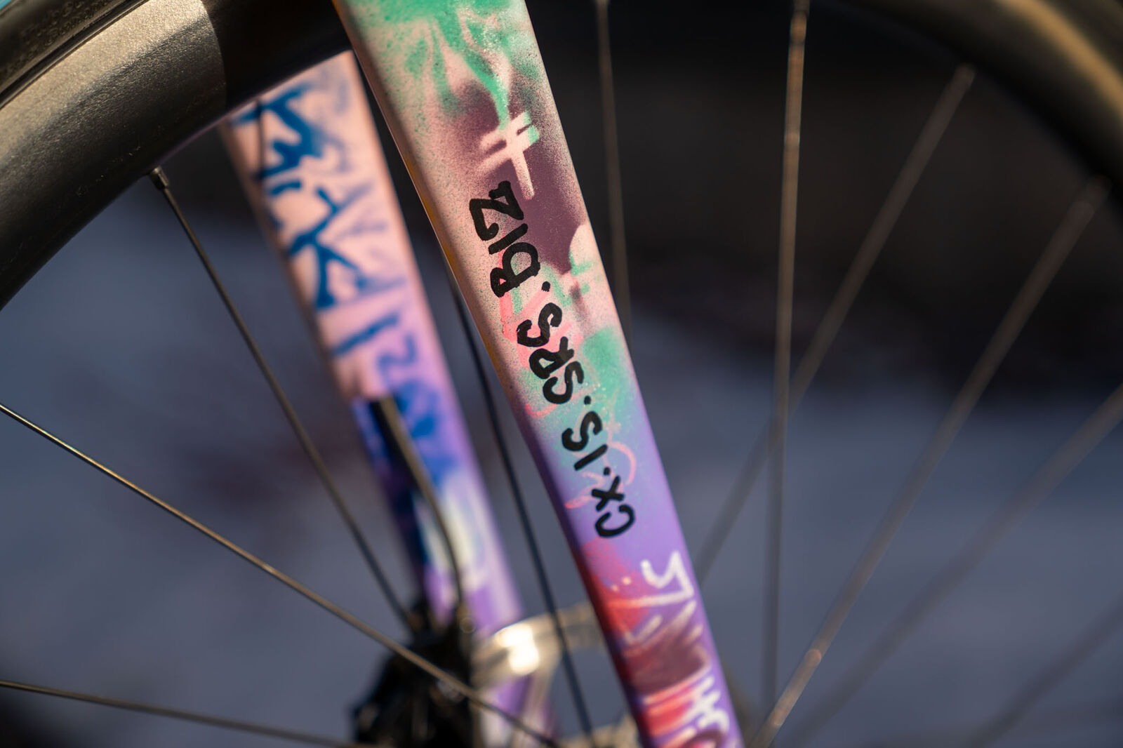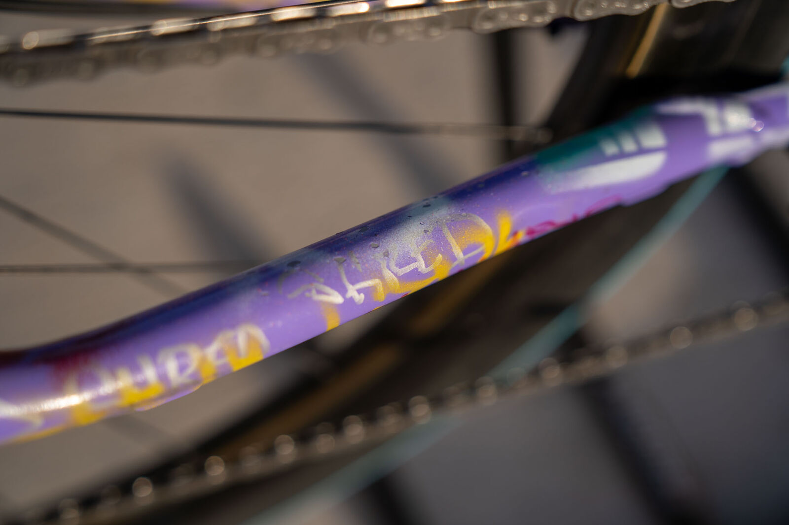 The paint job is full custom from Squid — the basecoat is a purple to pink fade and over the top is their "Bathroom" graffiti style. It's quite rad and one of a kind. It's a cyclocross bike, but also works well as a road bike or modest gravel bike. Tire clearance is up to 700x40c.