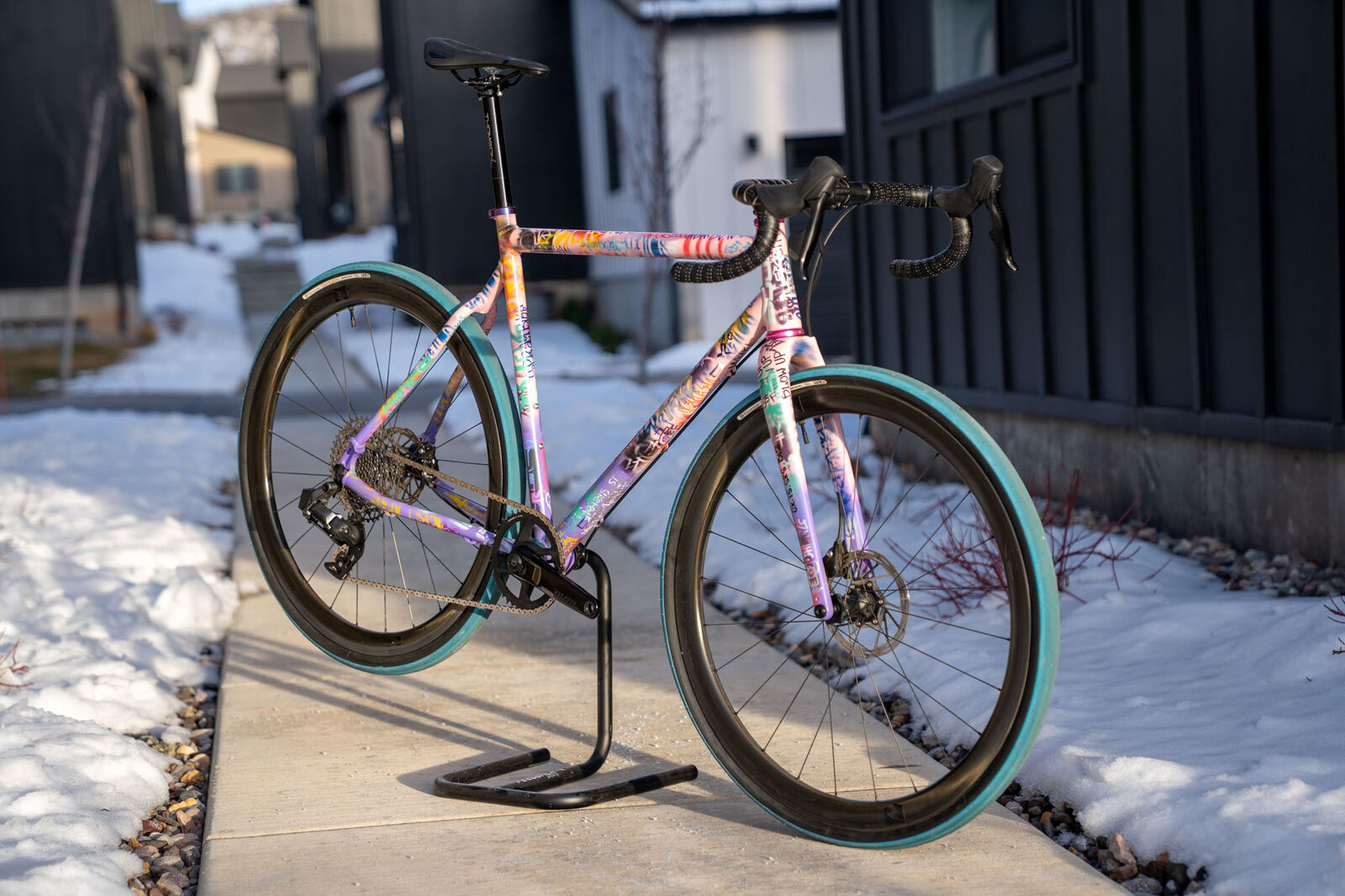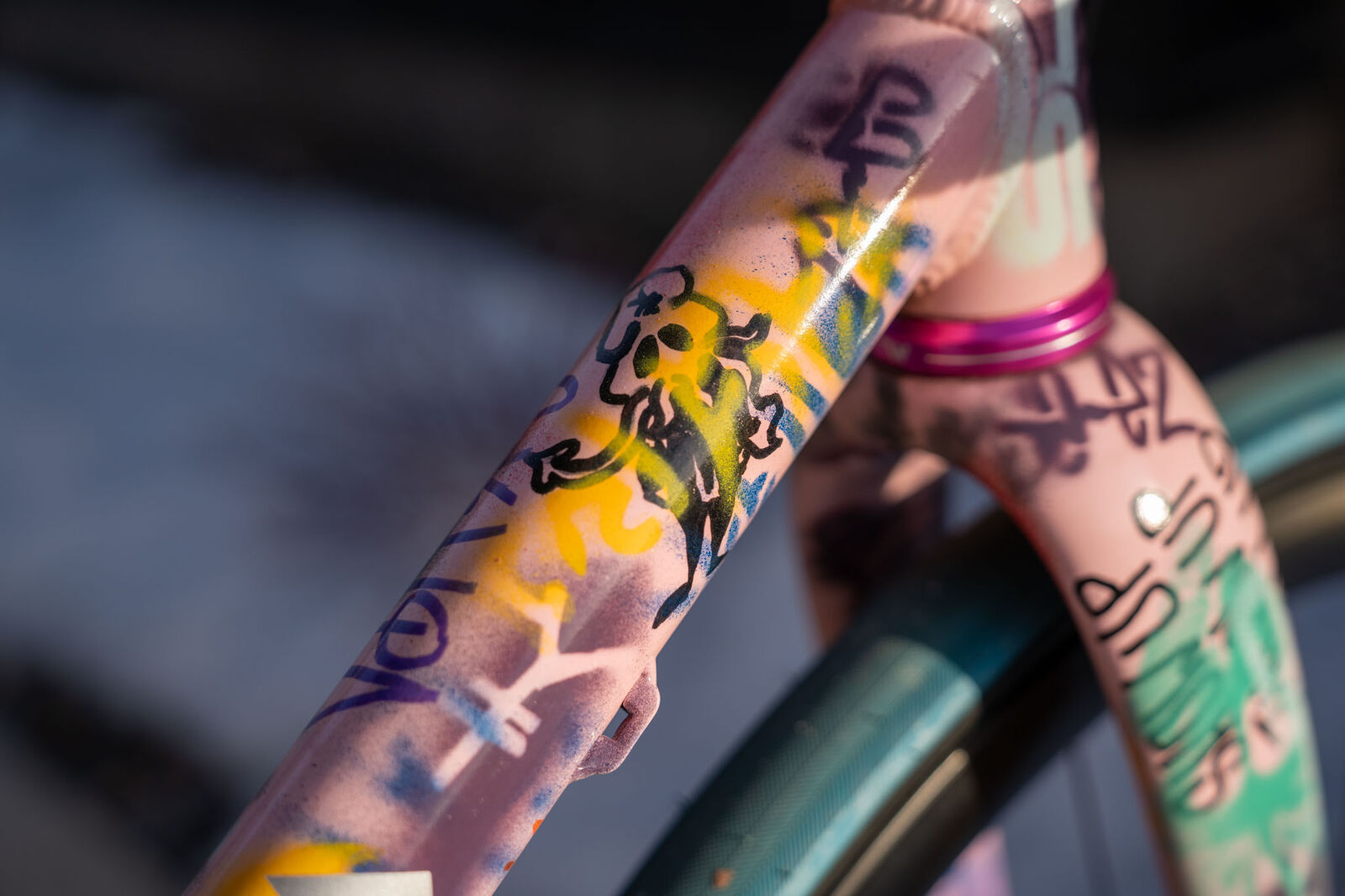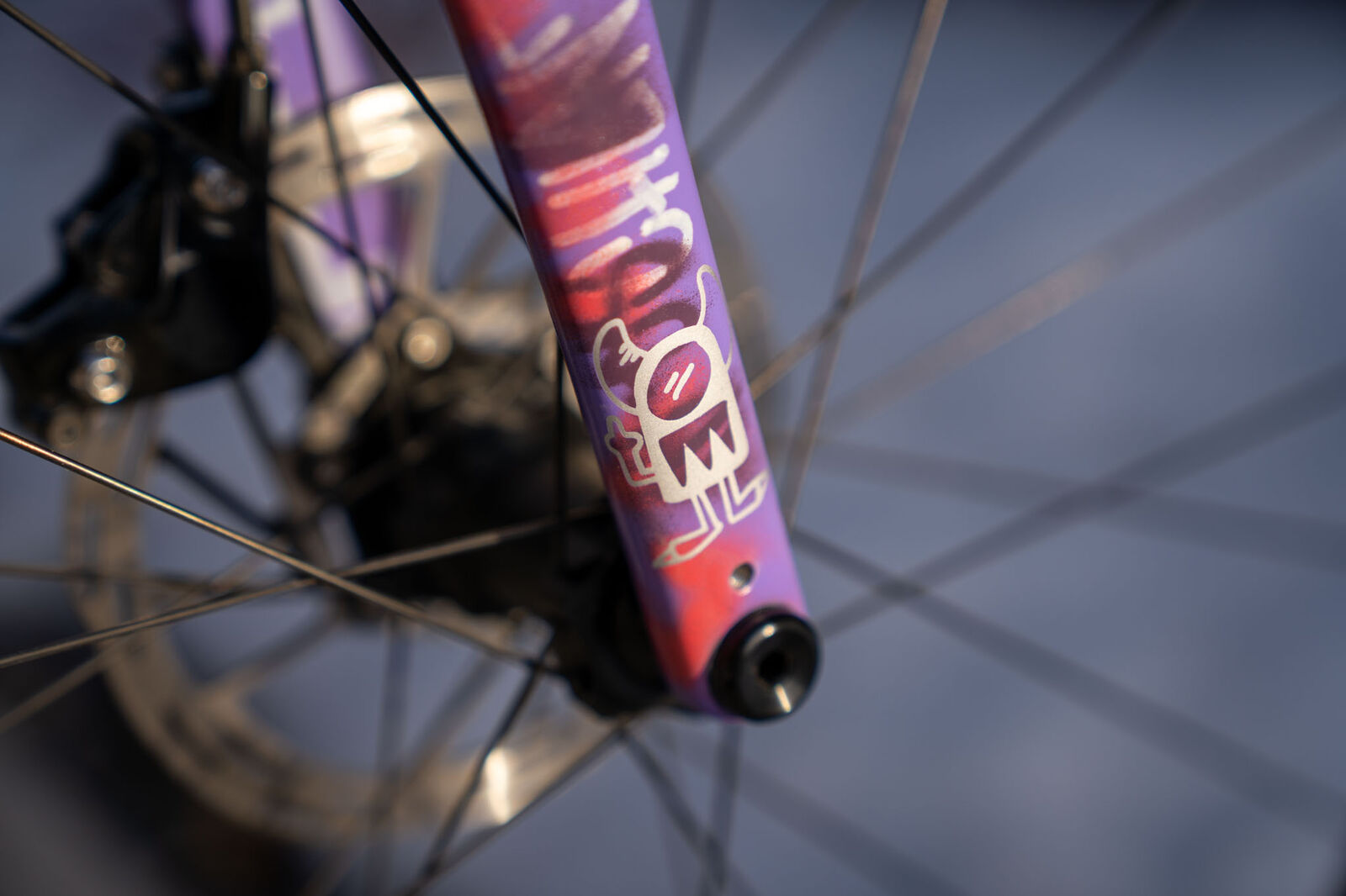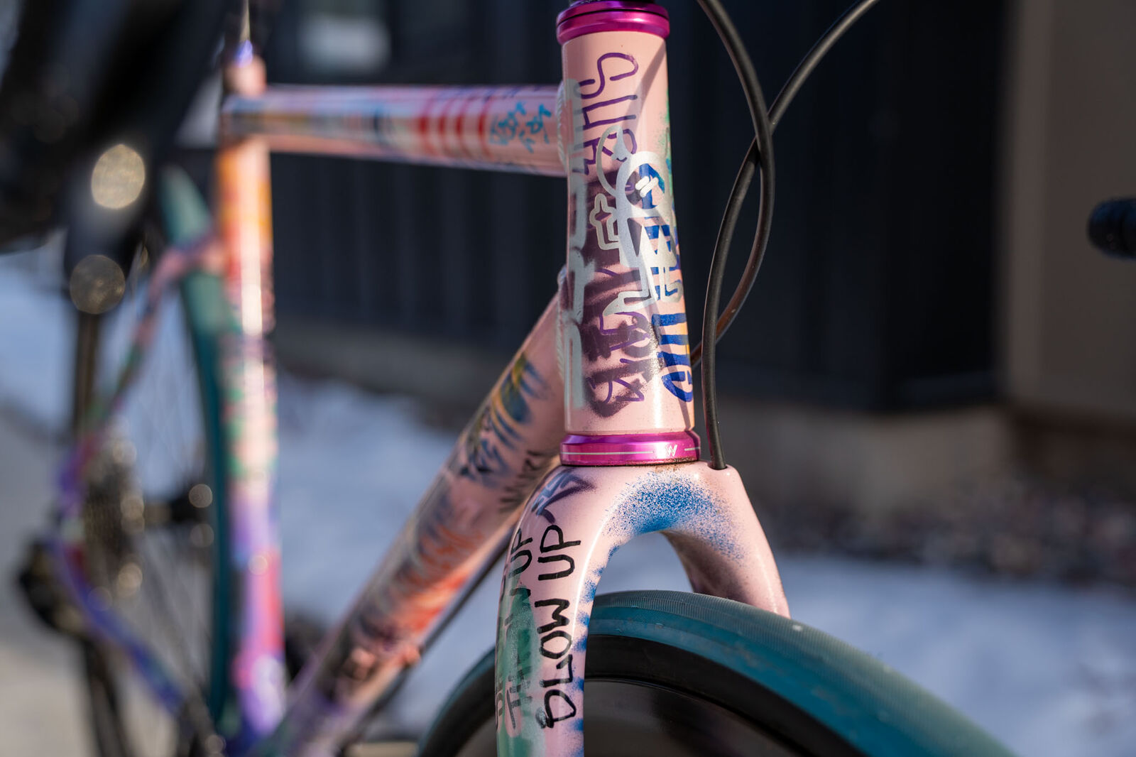 The paint job is full custom from Squid — the basecoat is a purple to pink fade and over the top is their "Bathroom" graffiti style. It's quite rad and one of a kind. It's a cyclocross bike, but also works well as a road bike or modest gravel bike. Tire clearance is up to 700x40c.
