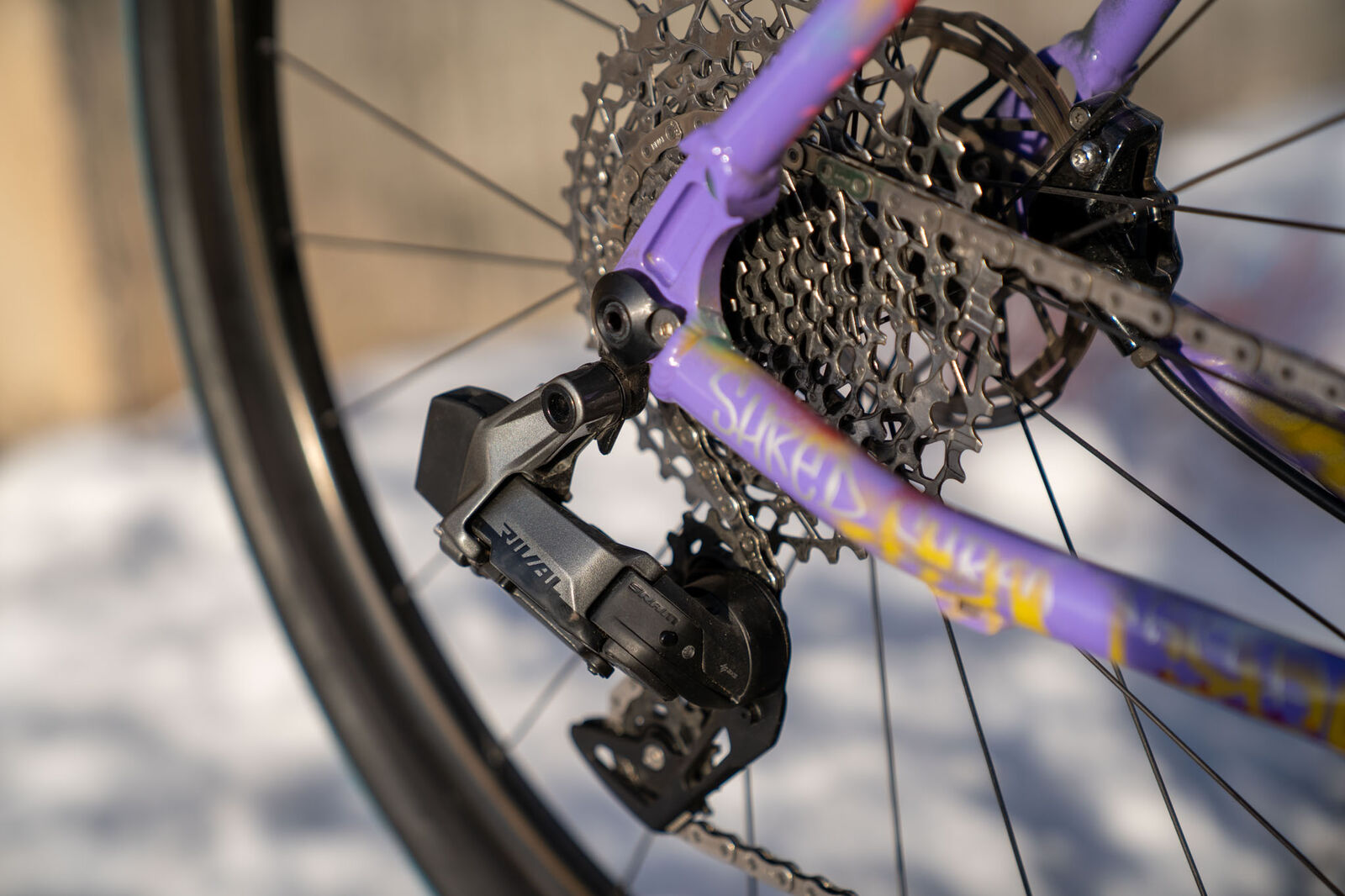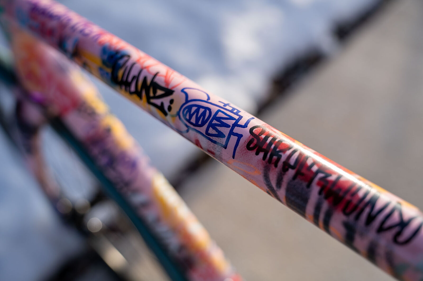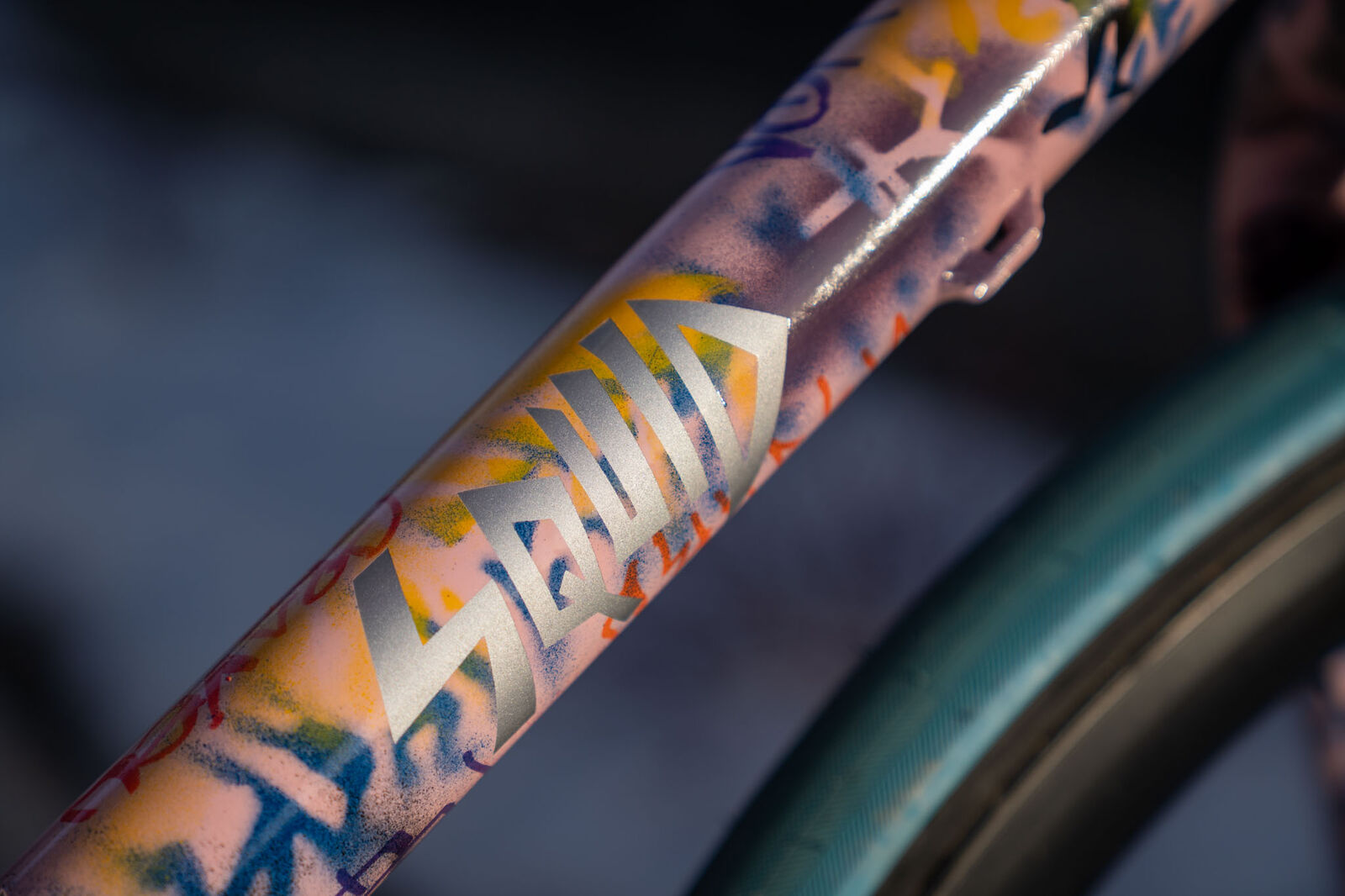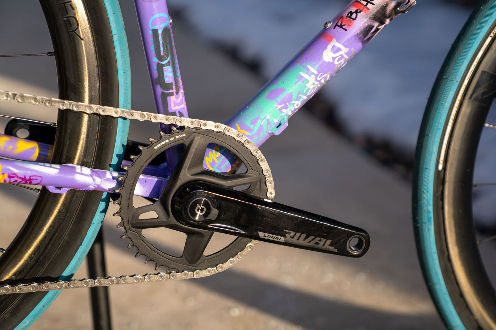 The paint job is full custom from Squid — the basecoat is a purple to pink fade and over the top is their "Bathroom" graffiti style. It's quite rad and one of a kind. It's a cyclocross bike, but also works well as a road bike or modest gravel bike. Tire clearance is up to 700x40c.