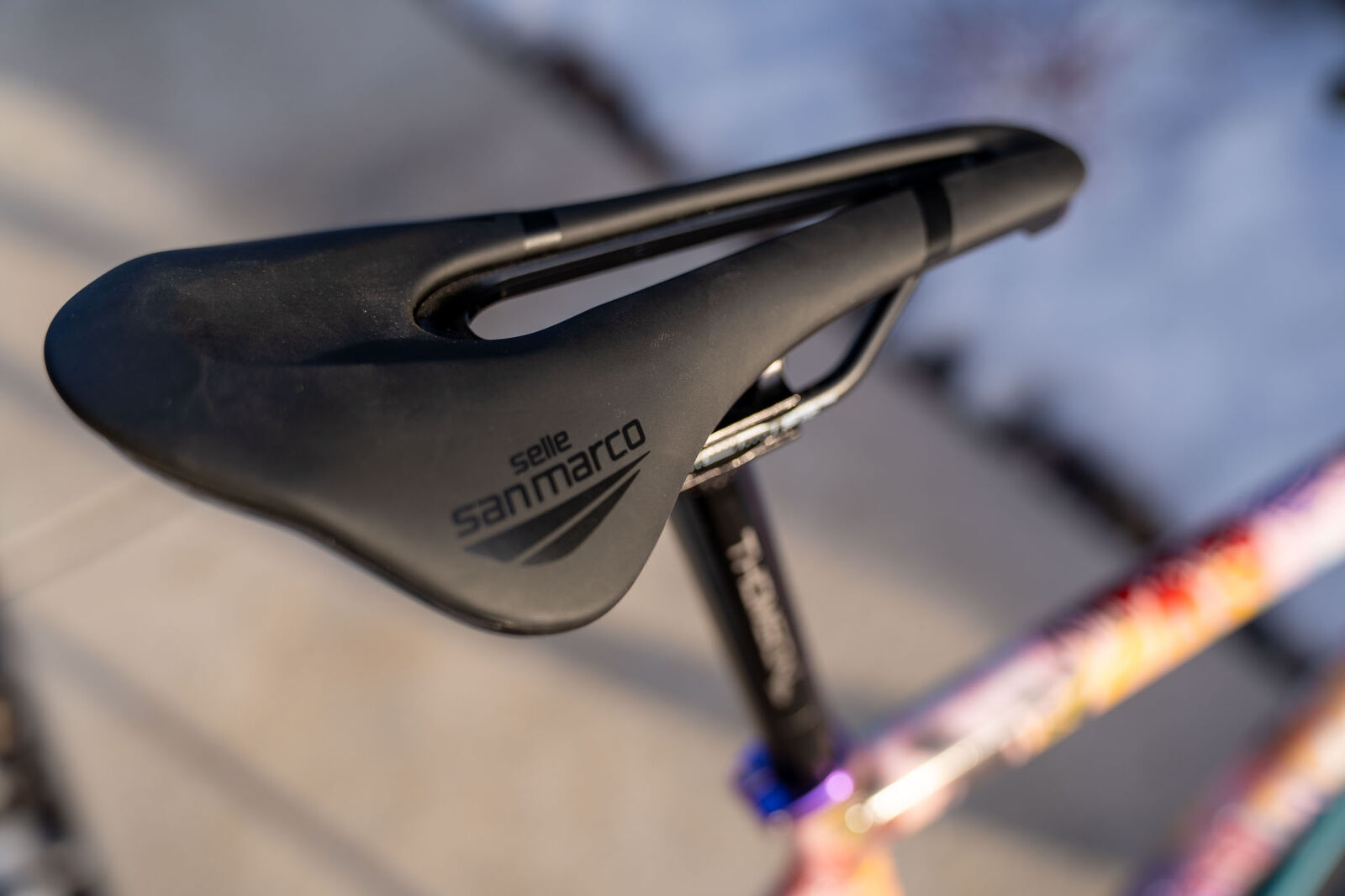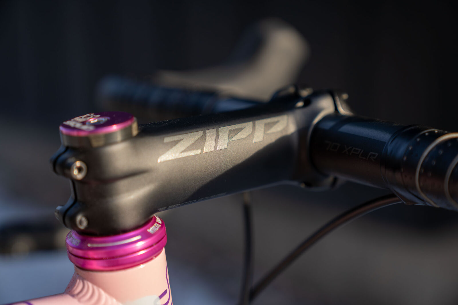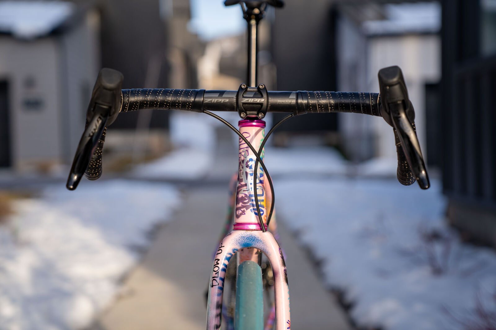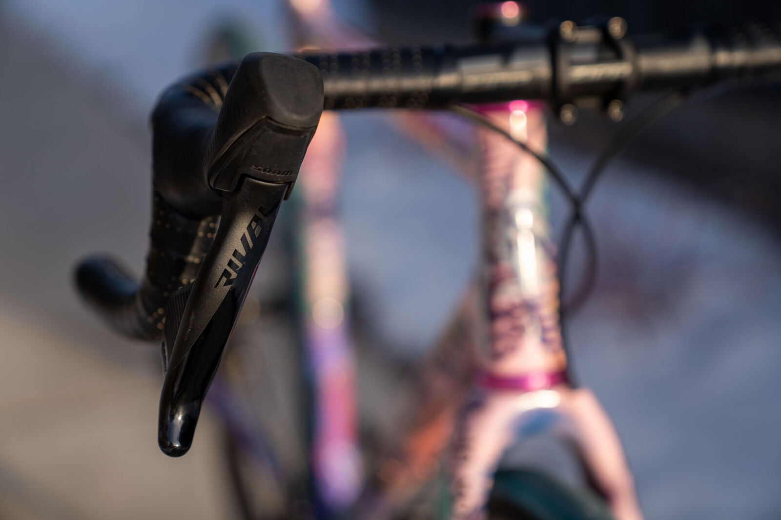 The paint job is full custom from Squid — the basecoat is a purple to pink fade and over the top is their "Bathroom" graffiti style. It's quite rad and one of a kind. It's a cyclocross bike, but also works well as a road bike or modest gravel bike. Tire clearance is up to 700x40c.