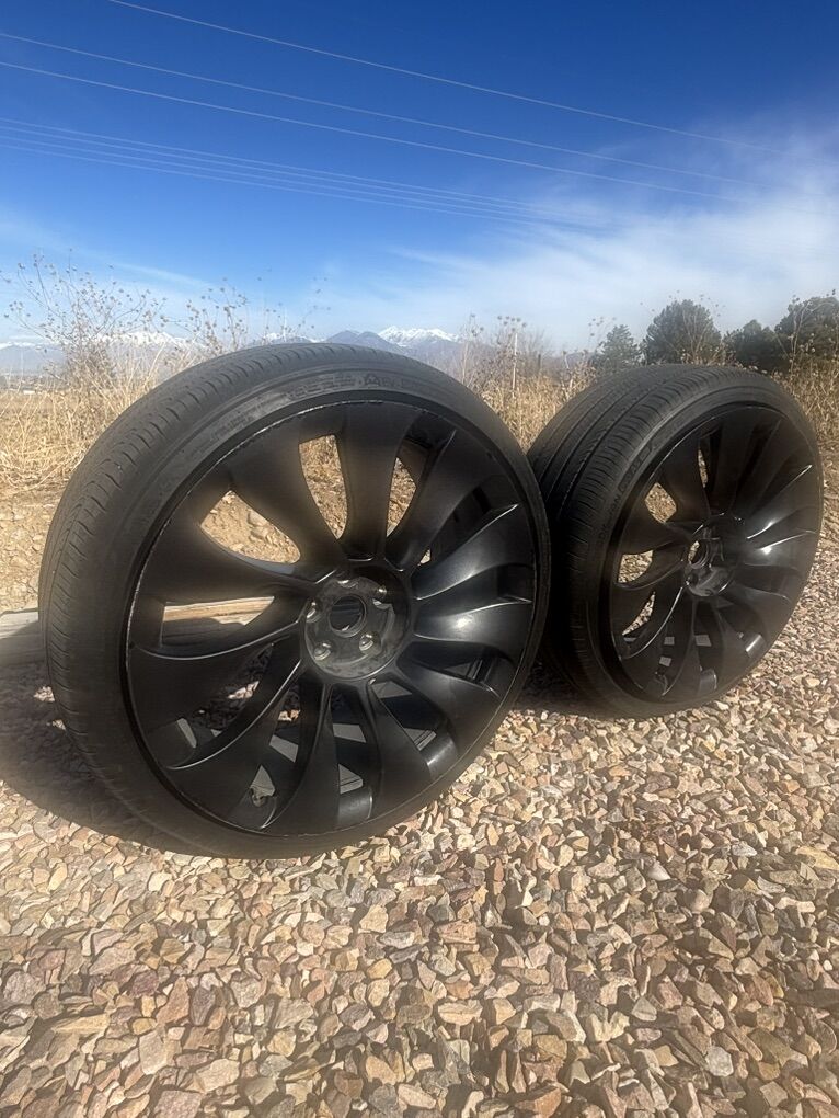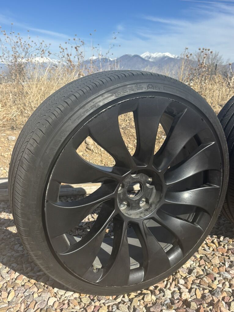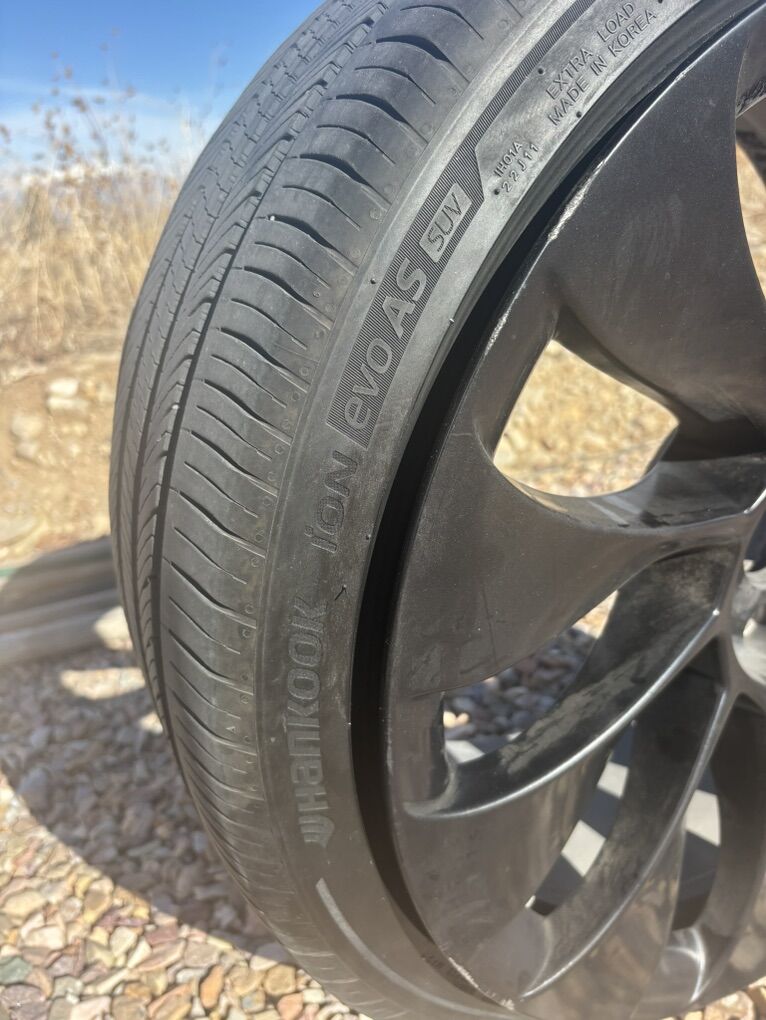 ZelleUPDATE: only one rim and tire is available now. Selling my front wheels off my Tesla Model Y Performance. Tires have 50% tread left. They are Hankook ION evo EV tires. The rims are both straight and have some curb rash, comes with center caps NO TPS sensors. Willing to sell rims separately and or tire separately.