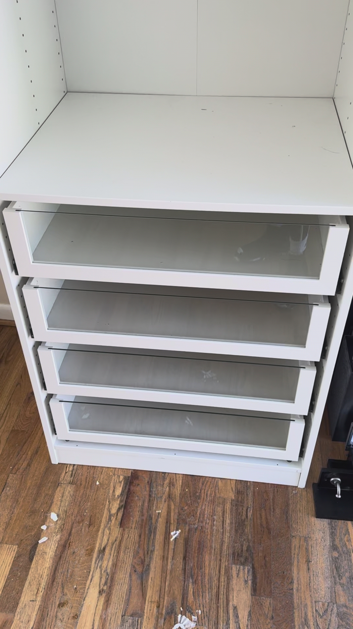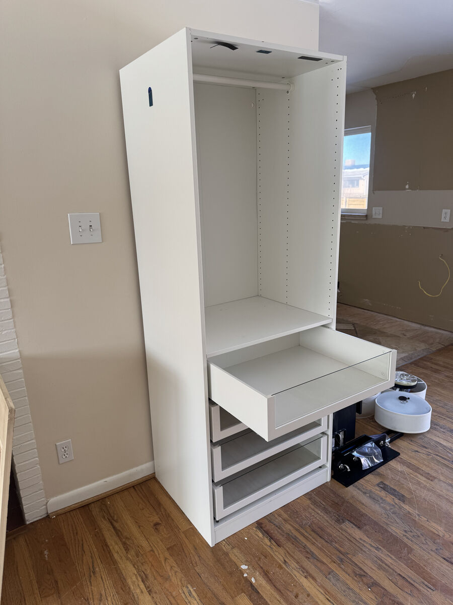 Included: • PAX frame (white) • 4 pull-out drawers (smooth glide) • Upper shelf • Hanging rod