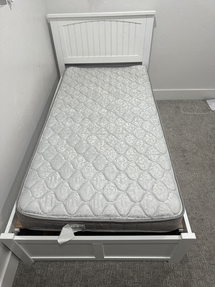VenmoTwin bed + Pull out Trundle + Mattress. Mattress is essentially new. It was always stored on the pull out trundle and I dont think was ever used. One of the bed support slats has been repaired, otherwise bed frame is in great shape. My son has outgrown the bed and we bought him a new one. This bed and mattress were both bought new from ikea. Text Preferred 435-660-1817. I could deliver to some areas in/near Provo for a small fee.