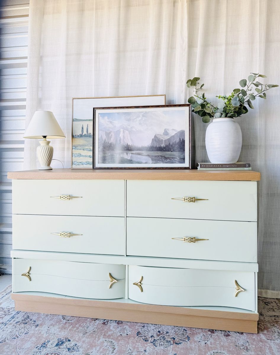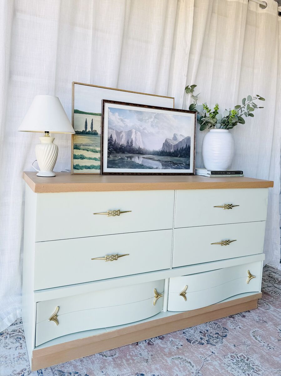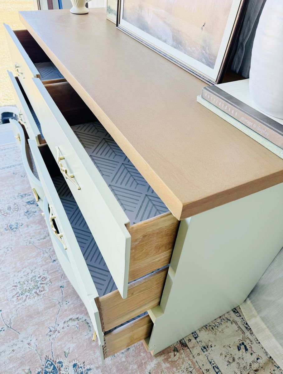 VenmoThis stunning 6-drawer dresser has been thoughtfully refinished to highlight its graceful curves and timeless silhouette. The body features a soft light green sage tone that complements the natural wood top, creating a warm and inviting contrast. Gold hardware adds a touch of sophistication, with unique arrow-style pulls on the bottom drawers that elevate the entire piece.