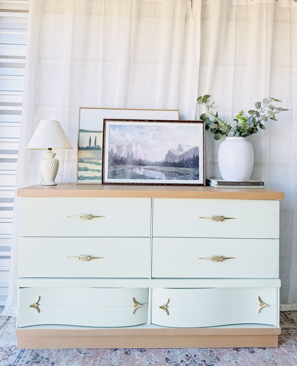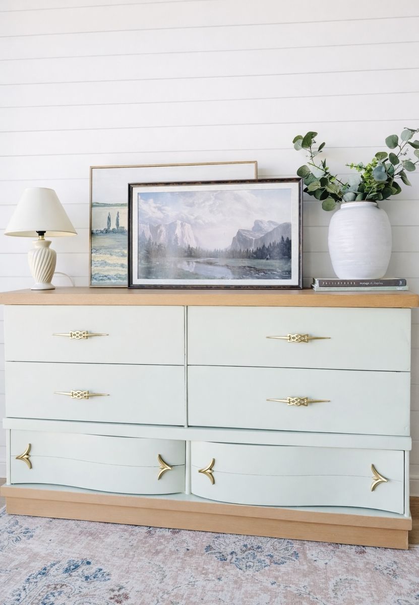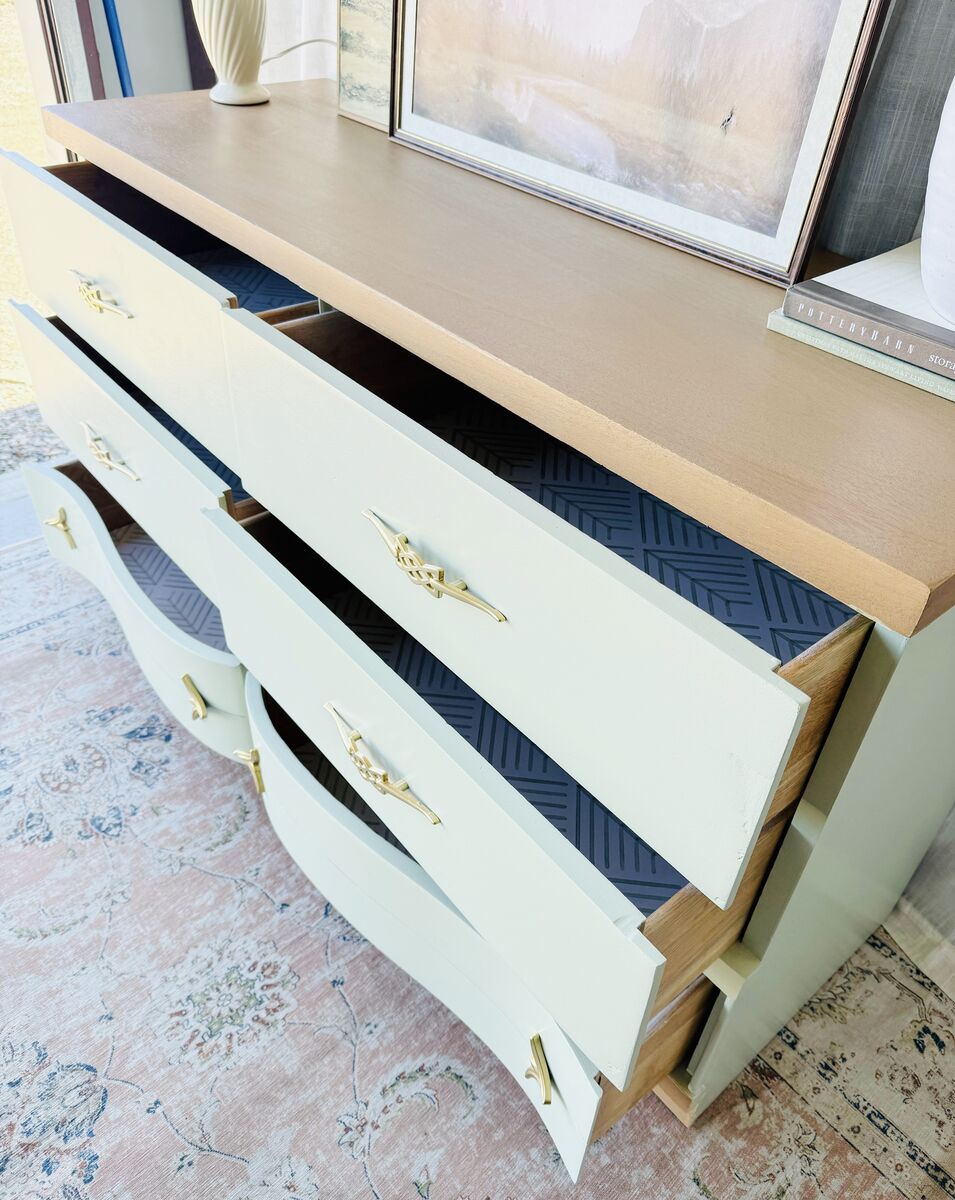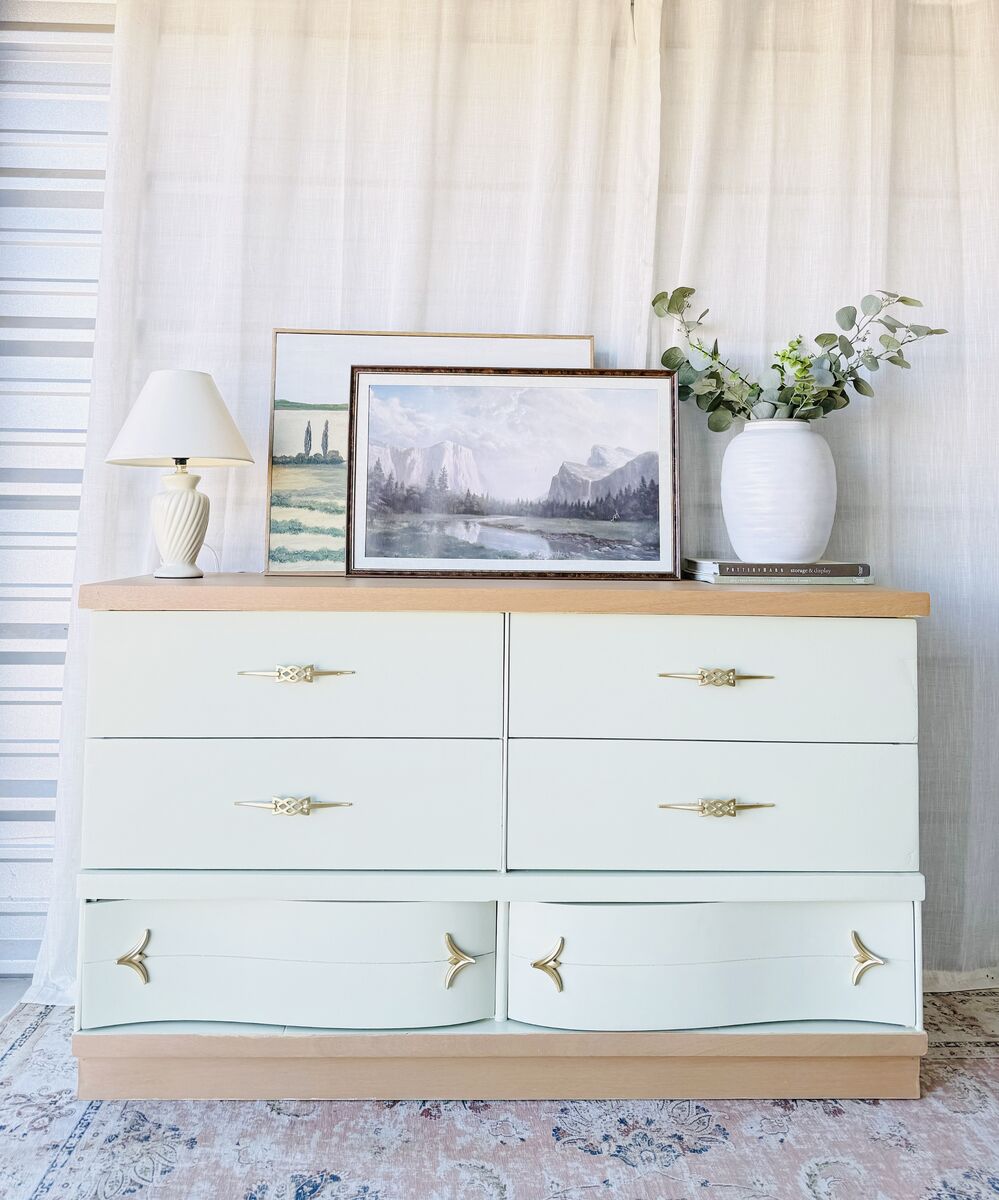 VenmoThis stunning 6-drawer dresser has been thoughtfully refinished to highlight its graceful curves and timeless silhouette. The body features a soft light green sage tone that complements the natural wood top, creating a warm and inviting contrast. Gold hardware adds a touch of sophistication, with unique arrow-style pulls on the bottom drawers that elevate the entire piece.