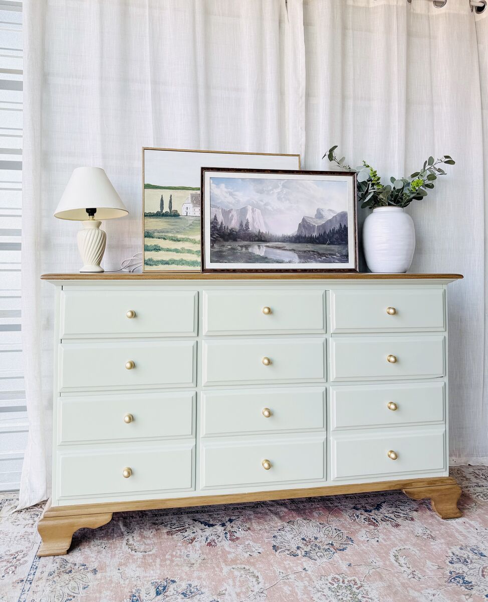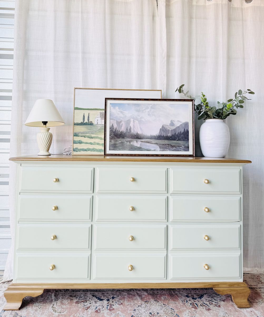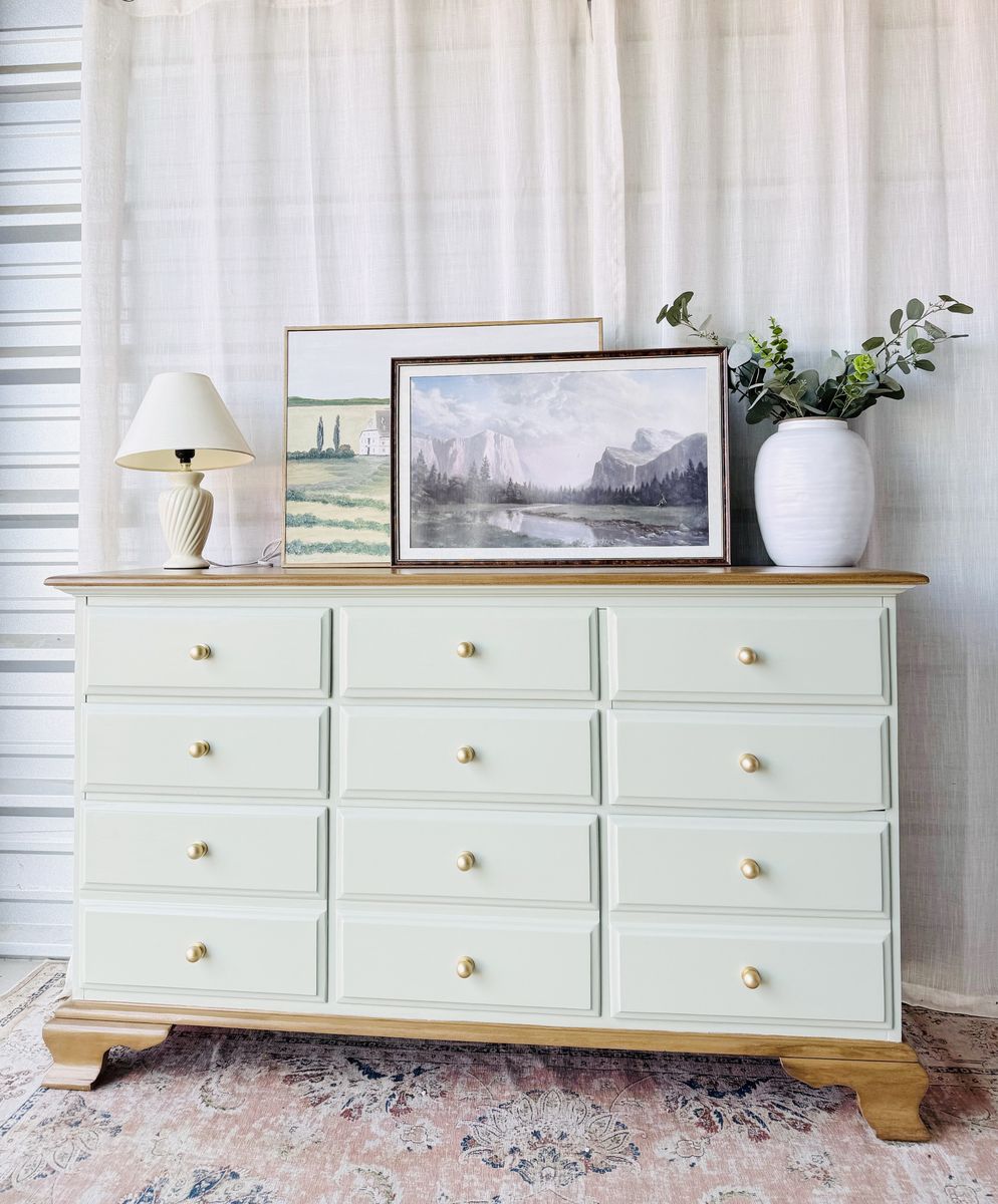 Refinished in a minty light blue sage green with a faux stain top & base. This piece brings a fresh yet timeless charm to any space.