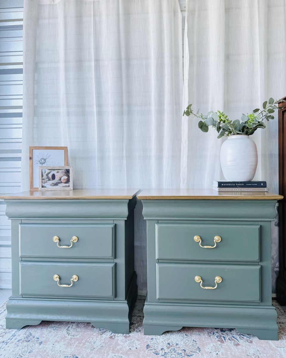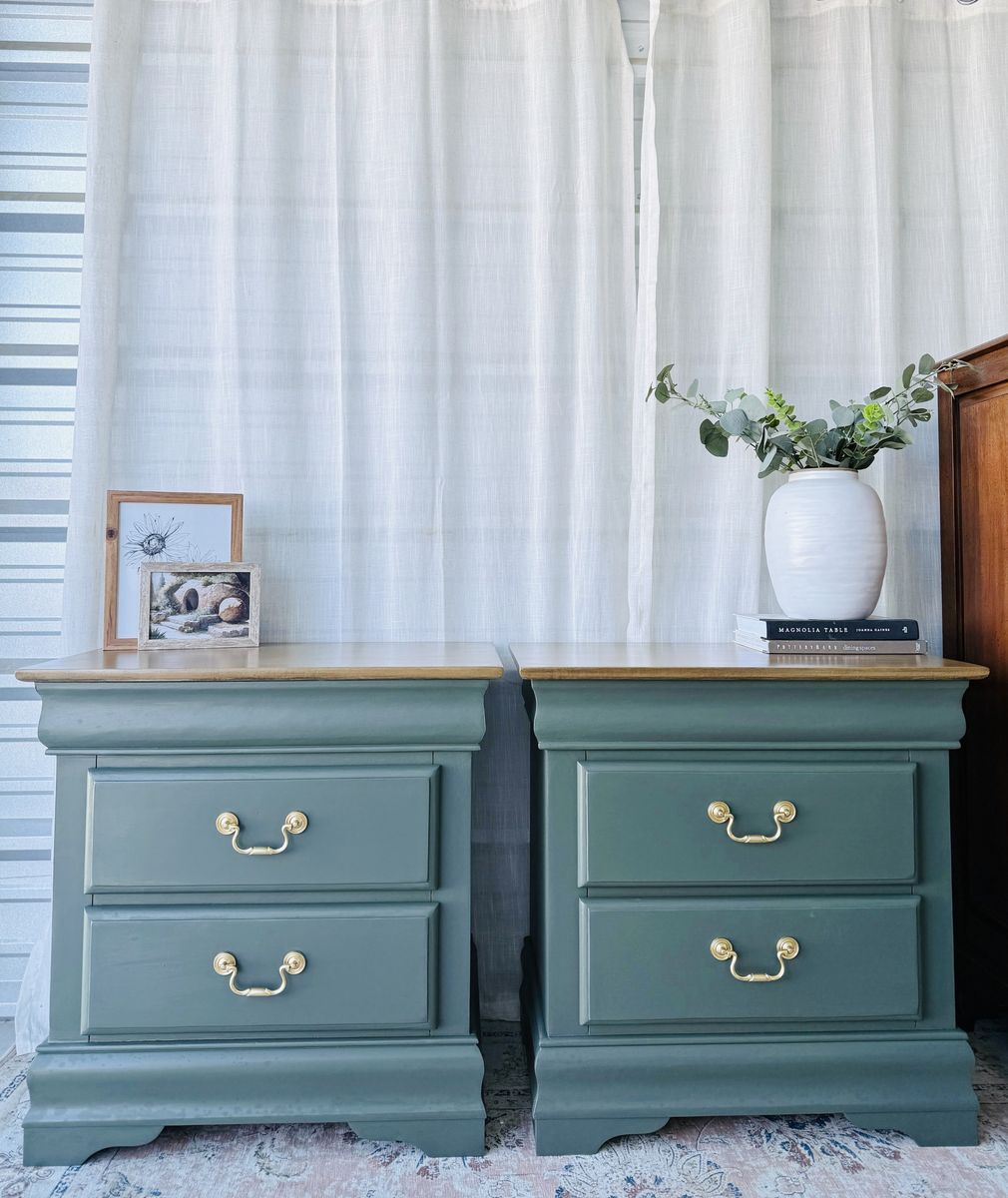 Refinished in moody dark jade green with a faux wood stained top. This set brings a fresh yet timeless charm to any space.