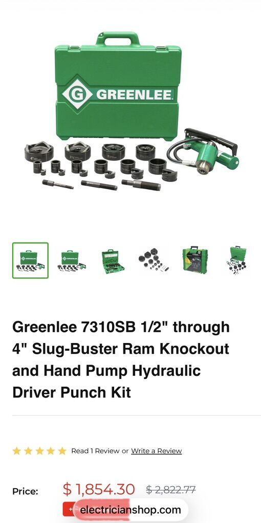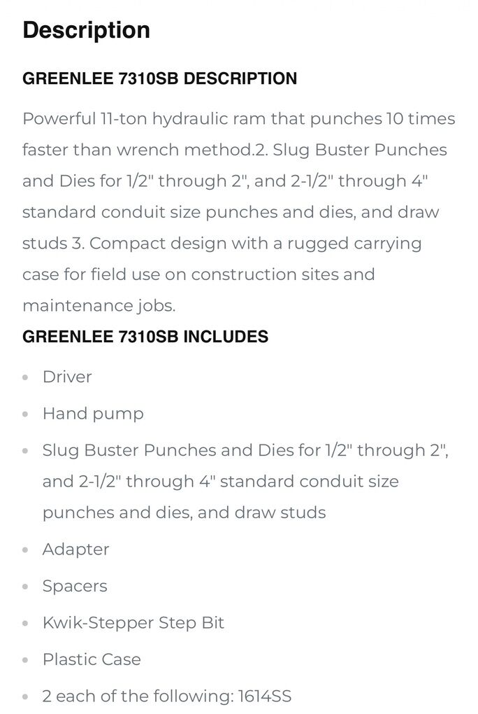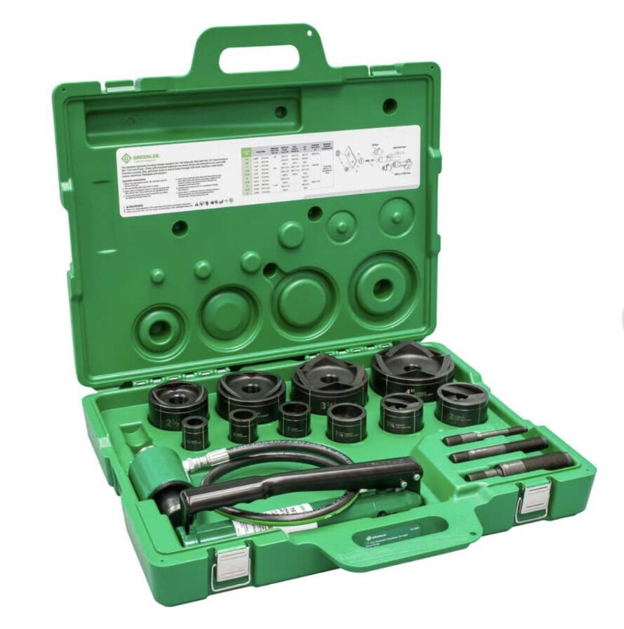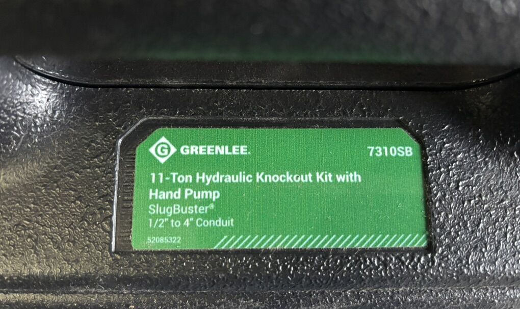 Description- 11-Ton hydraulic knockout kit with hand pump. SlugBuster 1/2”-4” conduit. See photos for more product information and specifications.
