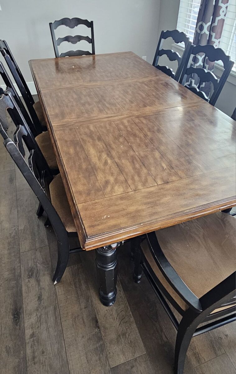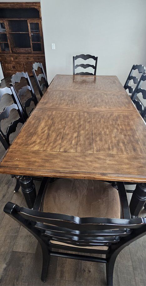 Quality Hardwood Dining Room Table with 8 Padded Executive Chairs. This is 96" L x 47" W x 30" H Full size with 2' leaf. Without leaf it is 72".