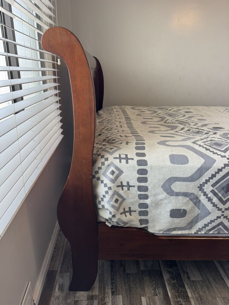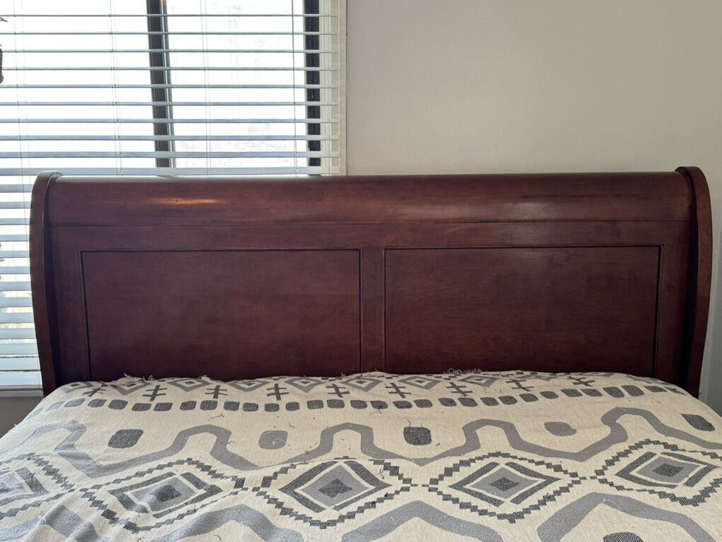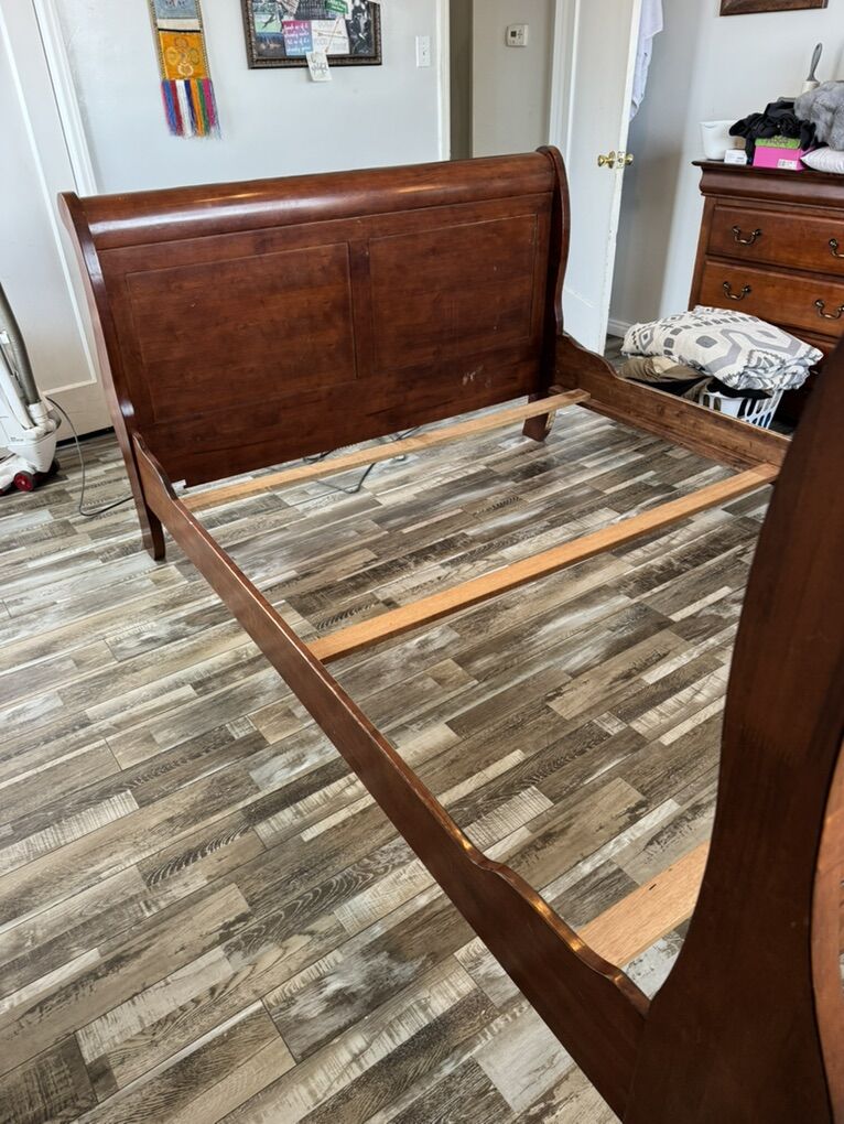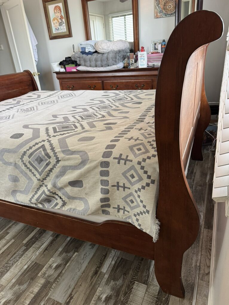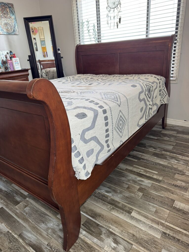 ApplePaySelling a used, solid wood, queen-sized bedroom set. Color is cherry wood. Includes the sleigh bed frame, nightstand dresser, and full sized dresser with mirror. Very durable and great quality! The tops of the dressers have some light scratching, dinks/dings. Unfortunately one of the legs of the sleigh bed for chewed on by a dog. I have included pics of the damage. Everything else looks good. Does not come with any mattresses.