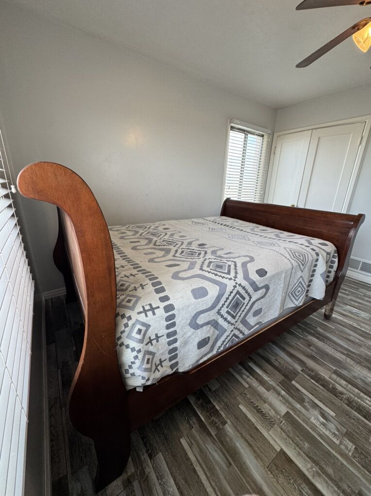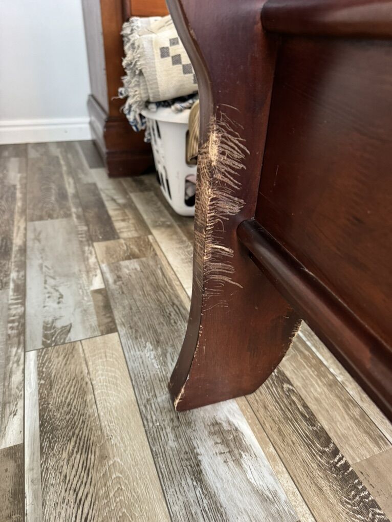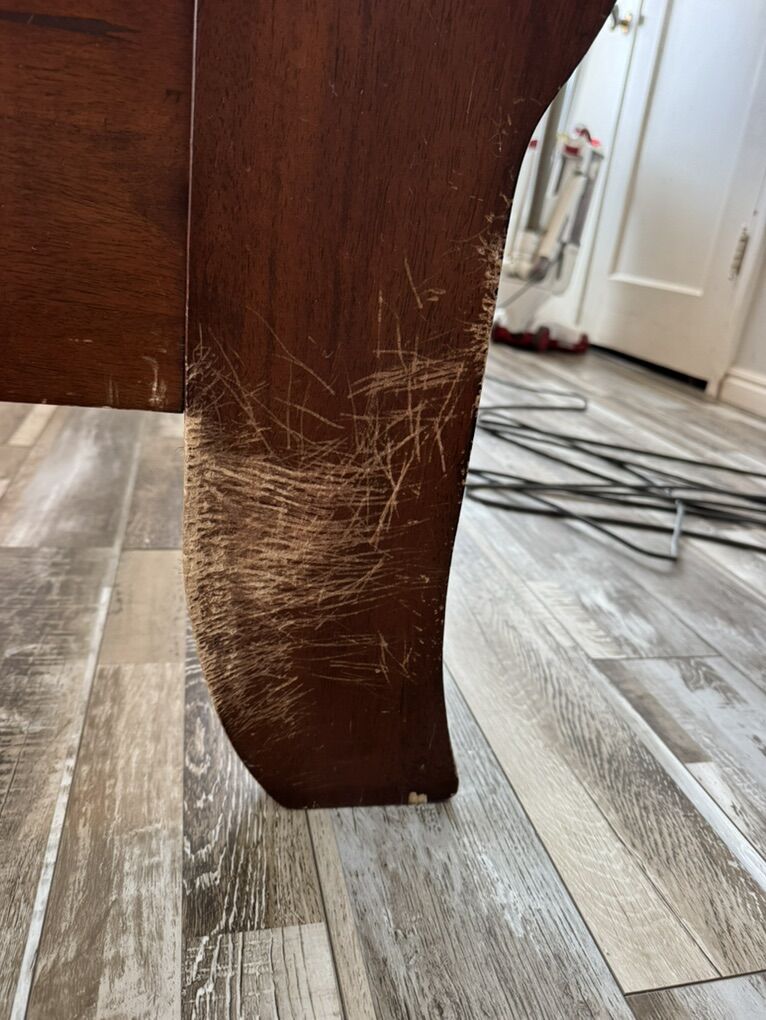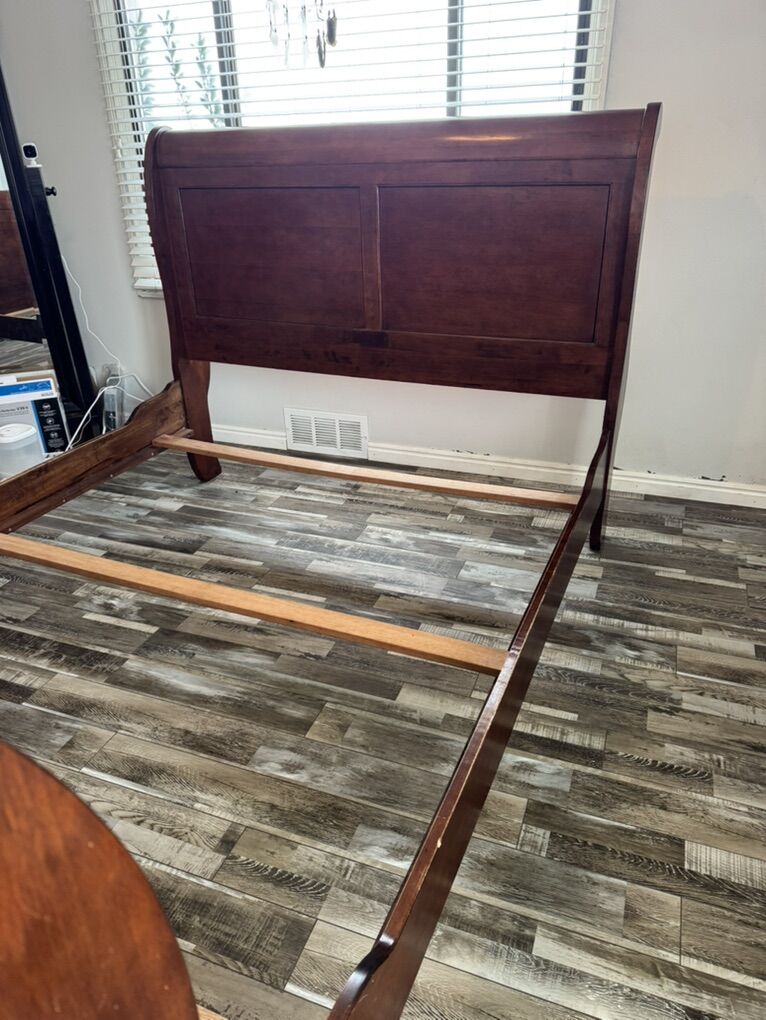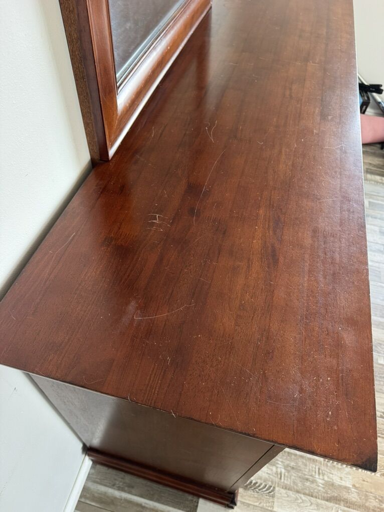 ApplePaySelling a used, solid wood, queen-sized bedroom set. Color is cherry wood. Includes the sleigh bed frame, nightstand dresser, and full sized dresser with mirror. Very durable and great quality! The tops of the dressers have some light scratching, dinks/dings. Unfortunately one of the legs of the sleigh bed for chewed on by a dog. I have included pics of the damage. Everything else looks good. Does not come with any mattresses.