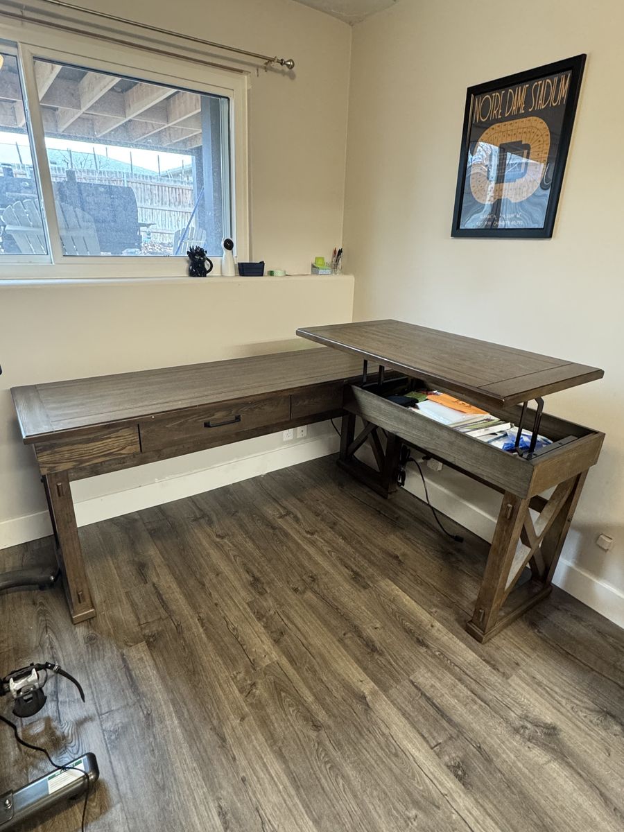 ApplePayUpgrade your workspace with this heavy-duty, L-shaped wooden desk. This is the manual sit-stand version, meaning it’s reliable, easy to adjust, and you never have to worry about a motor burning out.