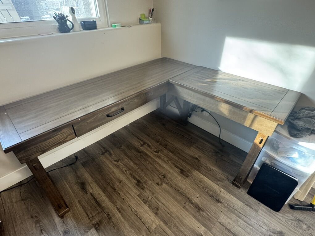 ApplePayWooden L-shaped desk with sit stand capabilities and two storage drawers. Measurements: 67x55in long 30in high Pick-up only: sandy area