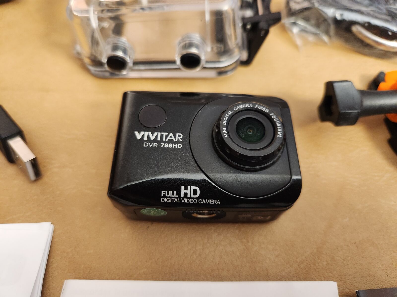 Vivitar "Go Pro" clone camera system DVR-786DH, mount on your helmet, waterproof cover, etc., all the extras needed. I bought it to film my trout fishing off my pontoon boat but never did it. The camera works well. Has mountings for helmets or whatever. (SD memory card not included....my 128GB SD card for it is $15 more).