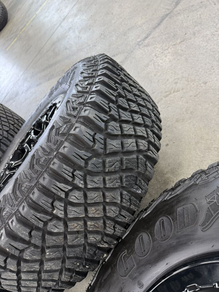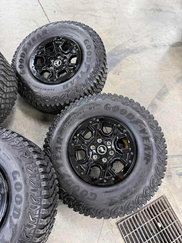 Wheels are 17in OEM wheels off a 2025 ford bronco badlands package. Wheels are in perfect shape. No curb rash, dings or major damage on them. All of the center caps are also included and in perfect condition as well. TPMS are also included and in perfect shape. Tires are 315/70/17 Goodyear wrangler territory m/t, top of the line tires, no patches or plugs in them. Tires have less than 1000 miles on them, and are pretty much brand new.