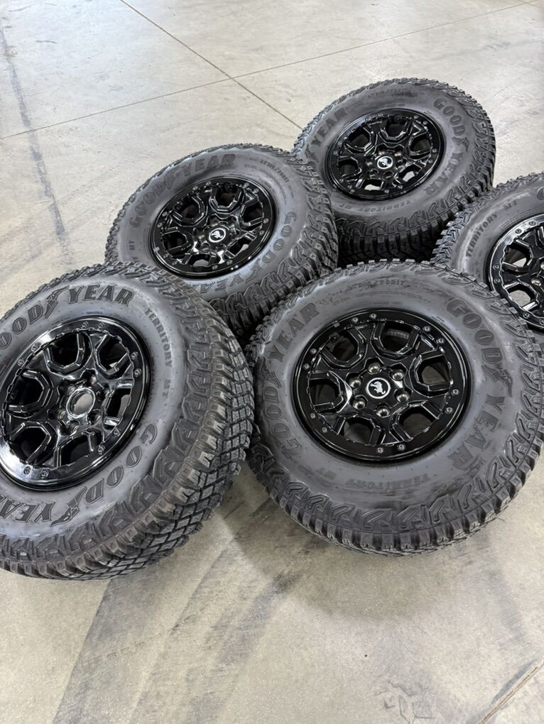 ApplePayBRAND NEW LESS THEN 1,000 MILES 17in OEM bronco badlands OEM wheels 315/70/17 Goodyear wrangler territory m/t tires