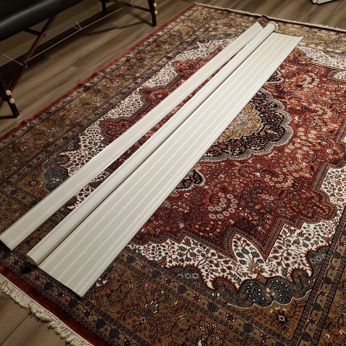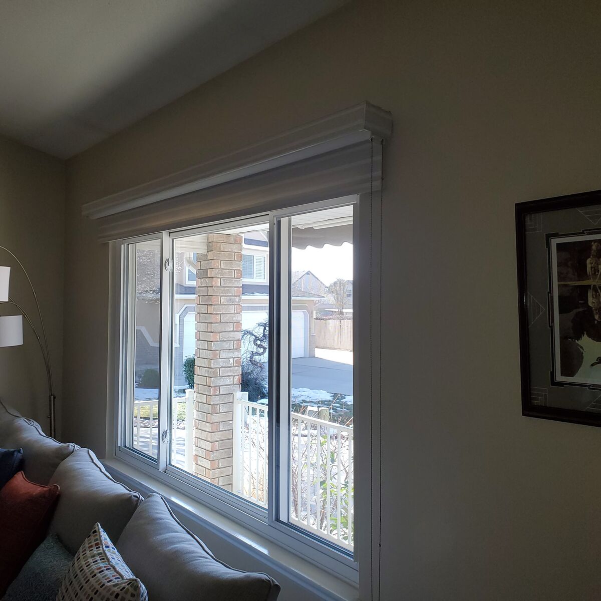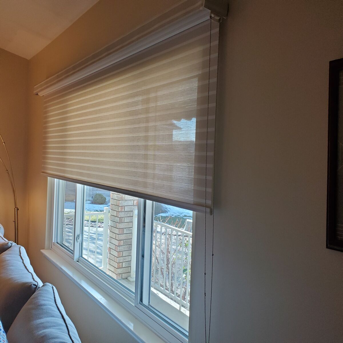 ZelleSolar window shade (blind) removed from home. Window was 95" x 59". Shade is 108" x 72". Color is Fawn. Shade is in excellent condition with a valance and all mounting hardware. Control is with a chain and drive was replaced 3 years ago. Easy to install.