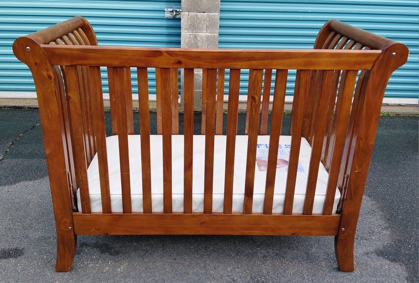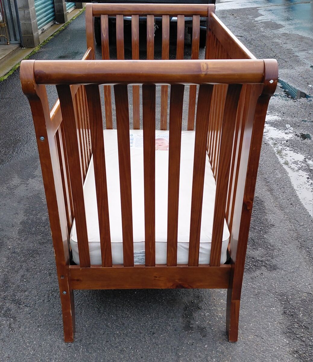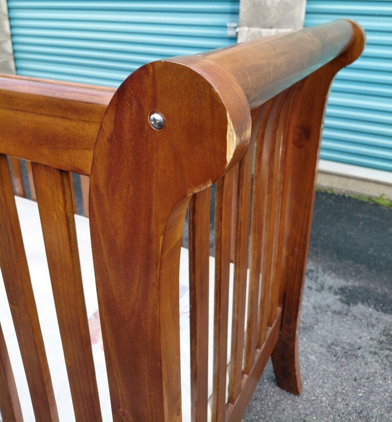 Mahagony, solid wood crib with some scratches. Beautiful, heavy, made well. Comes with mattress. It's in my Payson Storage Unit. We no longer need it.