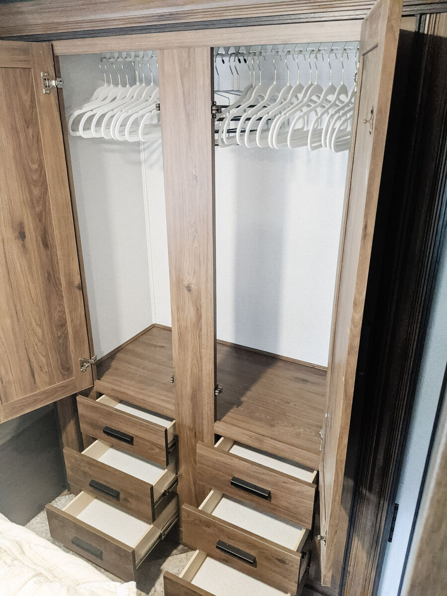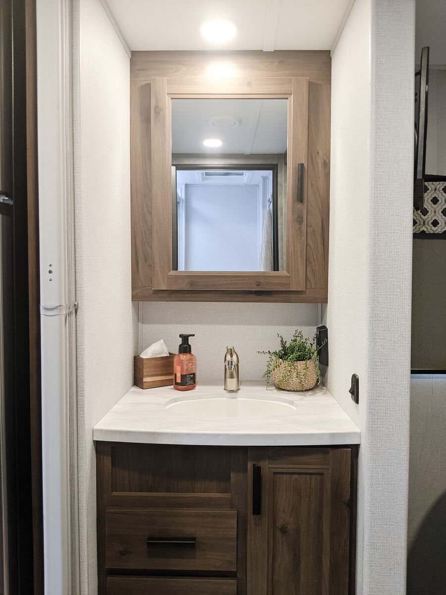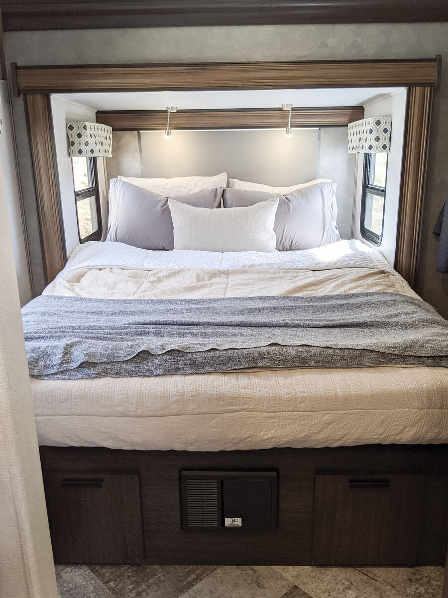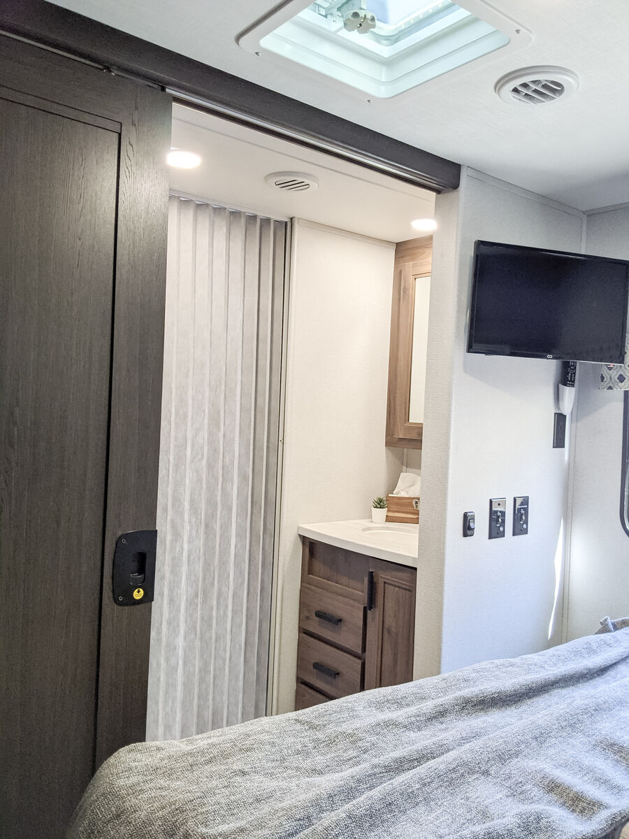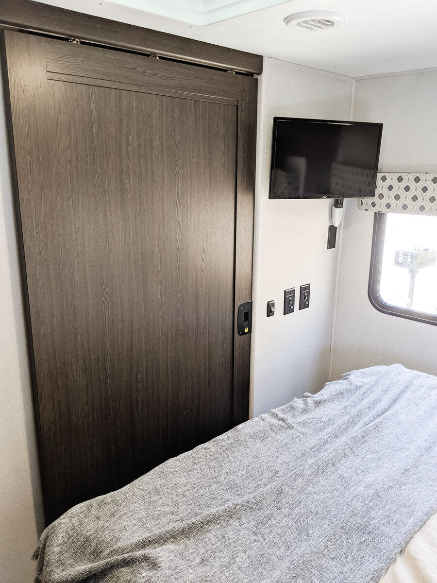 The kitchen has great counter space and storage, and everything is easy to access and use. There is plenty of interior storage throughout, plus exterior compartments for all your gear. The outdoor TV under the awning is a kid-favorite features for summer evenings.
