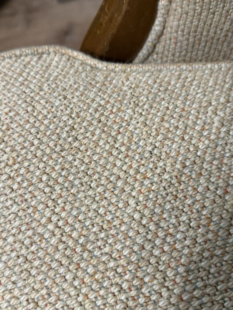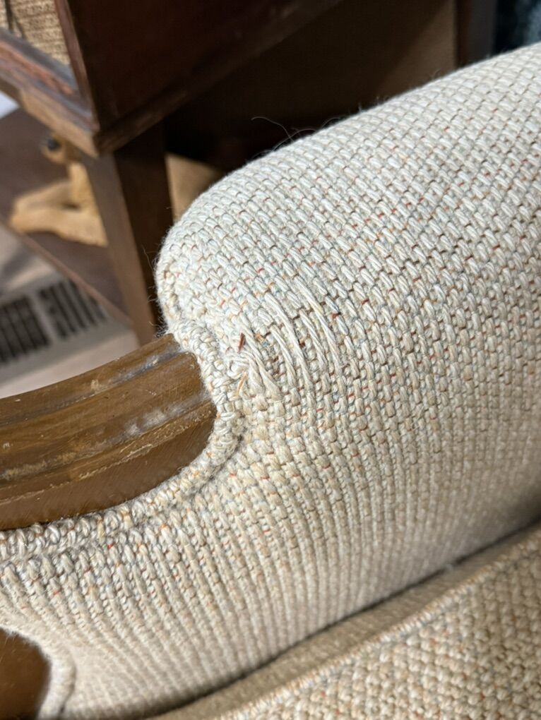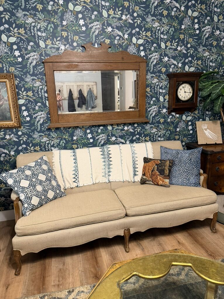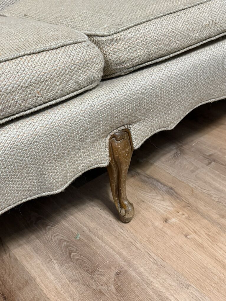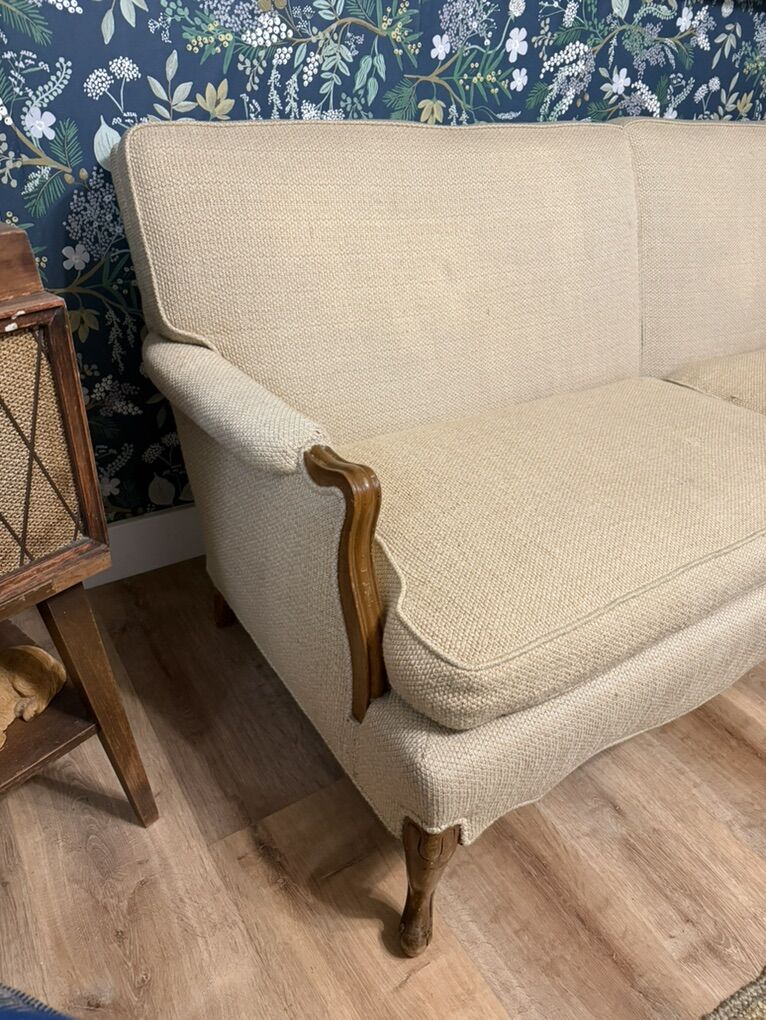 Darling vintage couch Wood has a few minor scratches Fabric is in good shape for its age. Measures 76 inches long 31 inches tall 34 inches wide Seat is 17 1/2 inches tall