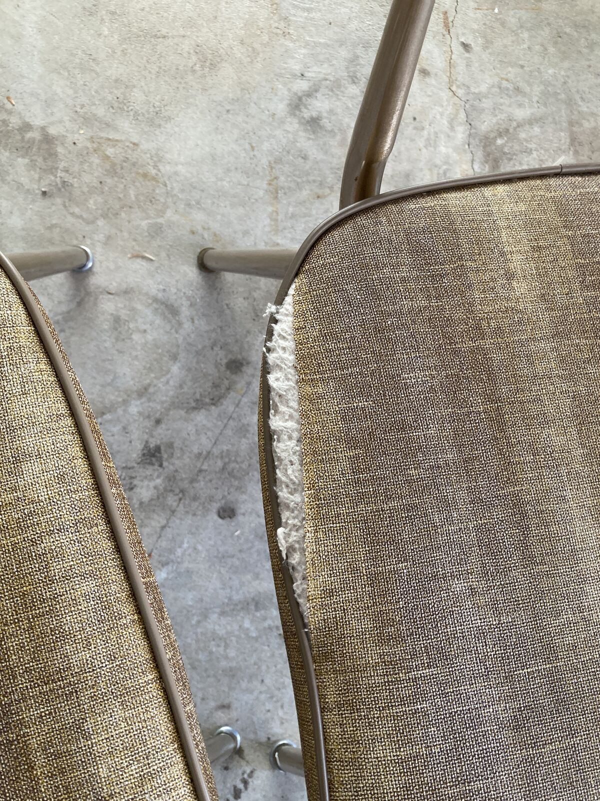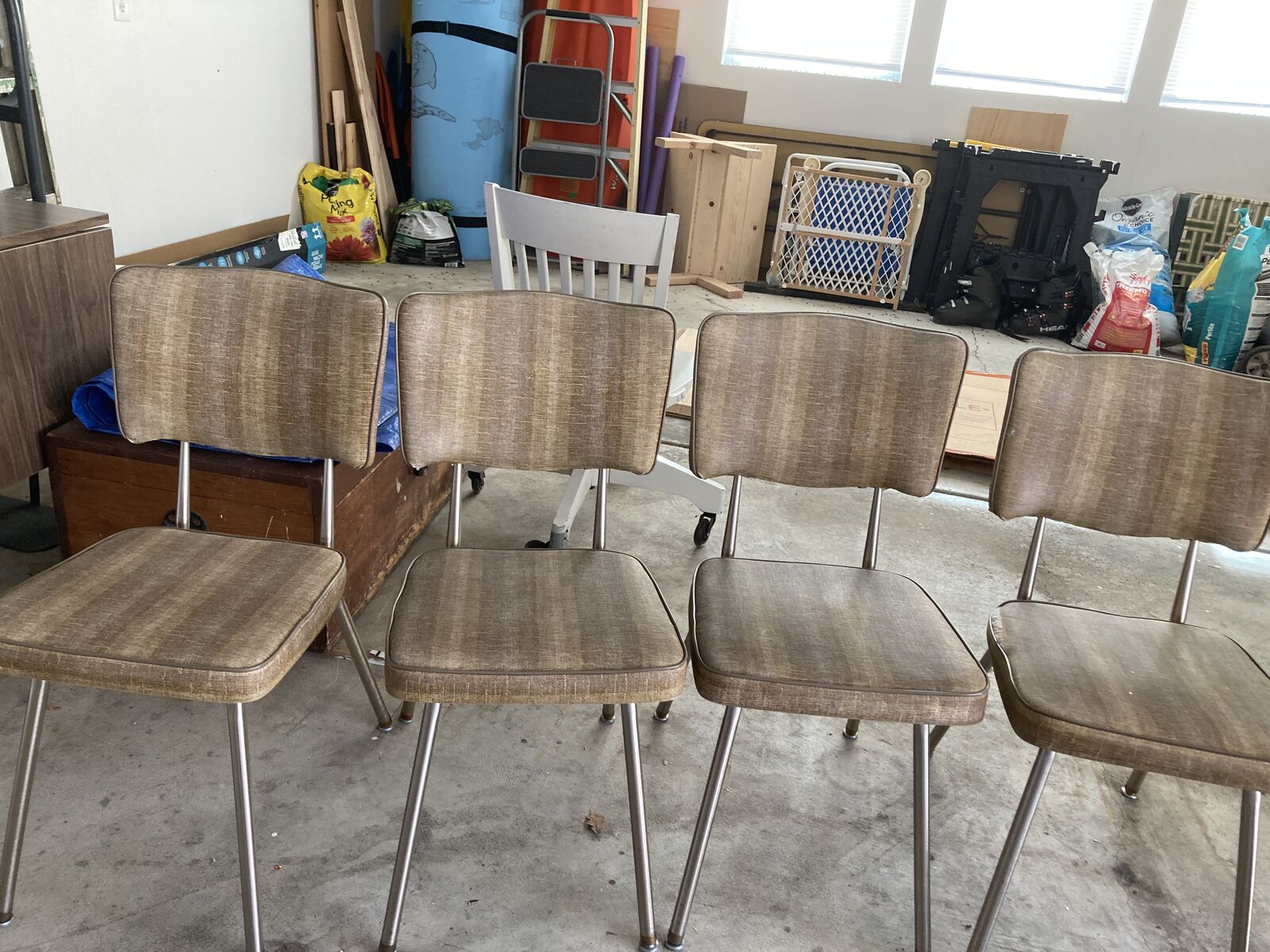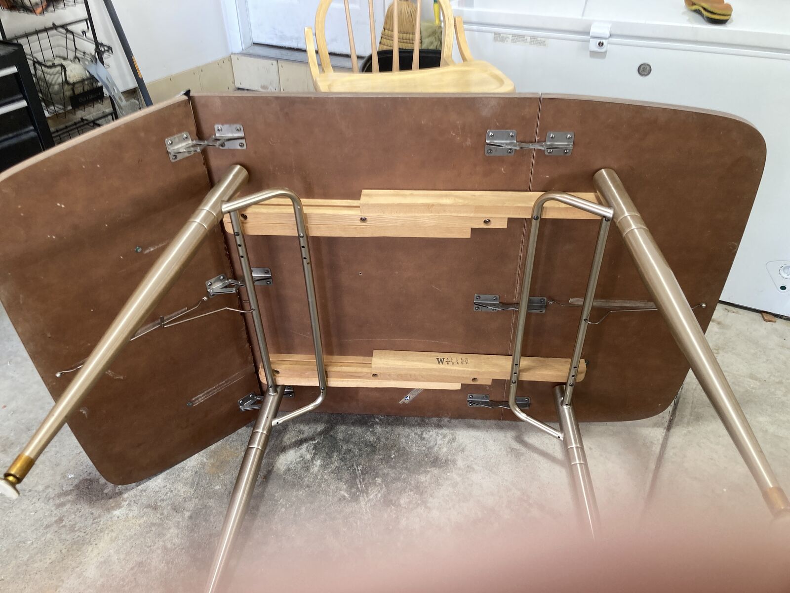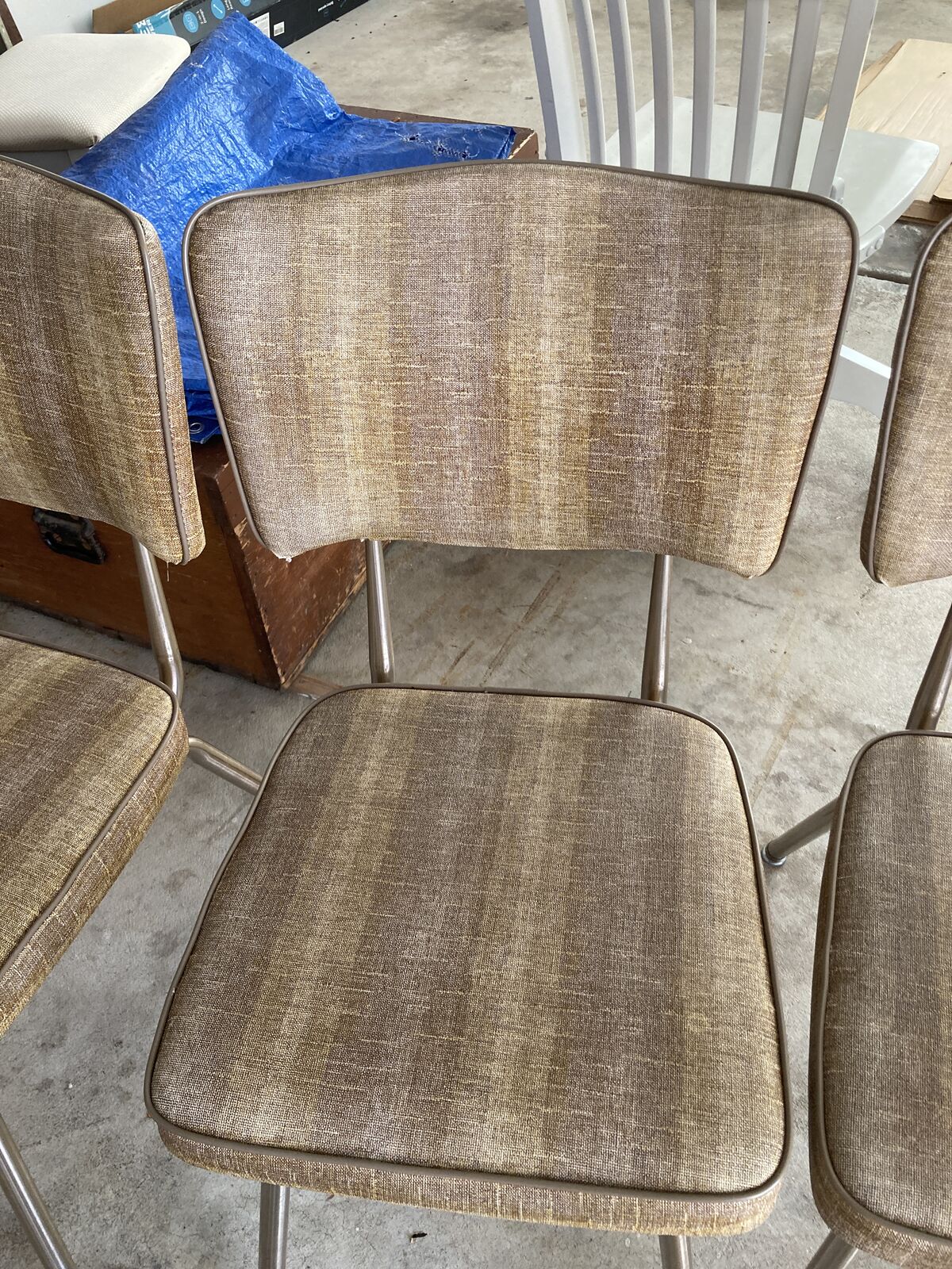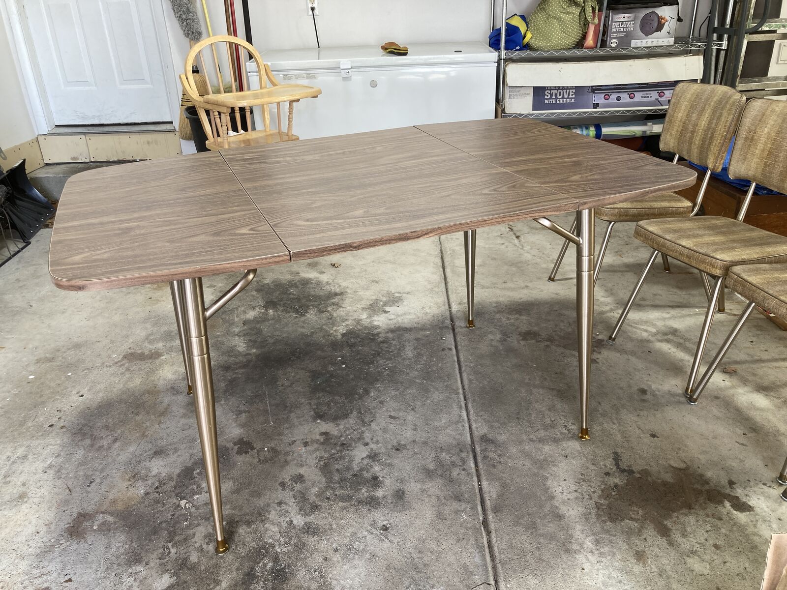 VenmoLaminate top, extendable dinette table. mid century, unique design with legs that slide out to extend, very sturdy. Original vinyl chairs, one chair is ripped at the seam