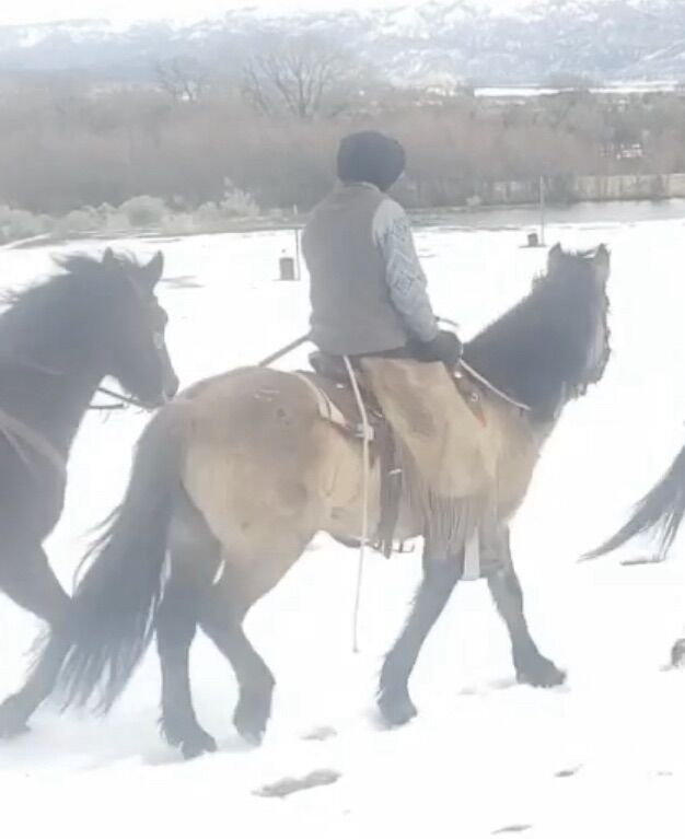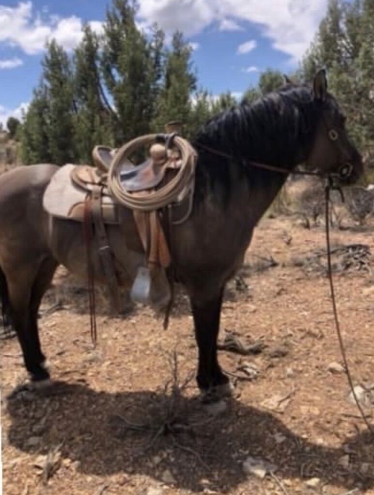 Late teens grulla mare. She’s been used on many trails, been roped off of (but just a bit in the arena) crosses everything. She’s 14hh and very stocky. She has a thick winter coat, but slicks off nicely to a pretty silver grulla. She’s solid and doesn’t need maintenance. Very easy keeper. She can be turned out or stalled. Not the top or bottom horse. Not a bit mare-ish. She’ll ride out alone or in a group and just follow along. She’s been my son’s horse, but he’s outgrown her. Would make a great step up horse or for a lady. She has very hard feet and doesn’t require shoes. I ride her bare foot. We’ve only really used her on trails. No real arena experience. She has a few quirks. She doesn’t like atv’s or bikes. She occasionally gets a bit cinchy, but is fine if not tied while cinching. I usually just untie her and have no problems. She doesn’t like to be first in the trailer or can be hard to load sometimes. Doesn’t like her feet handled.