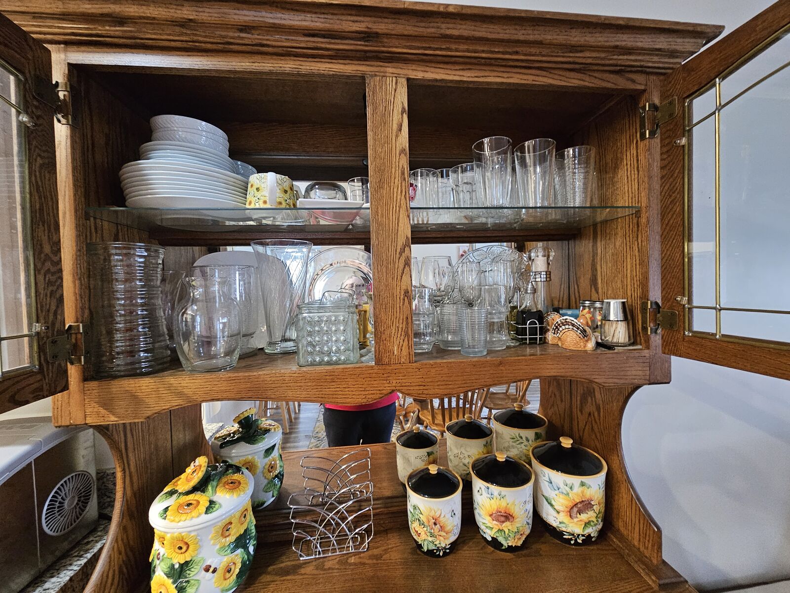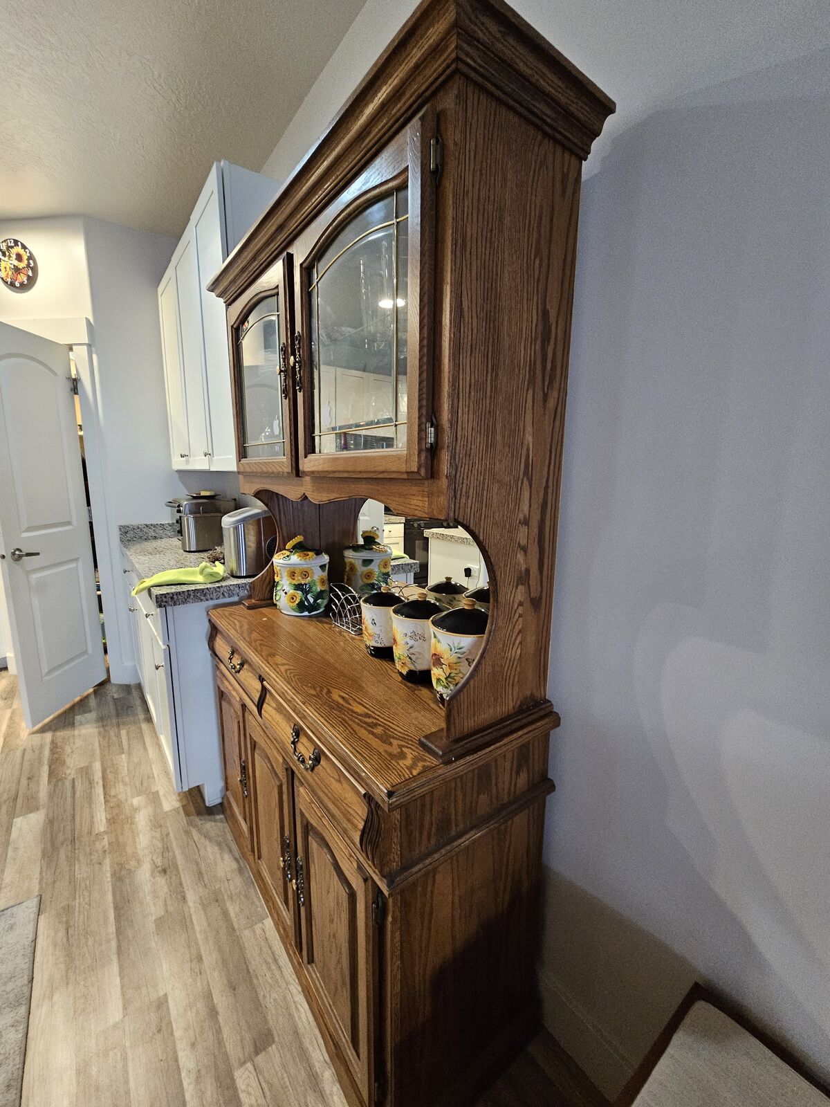 Hutch, 44" x 48" x 14". One glass shelf, light (will need new light bulb; sample included)., 2 glass doors.